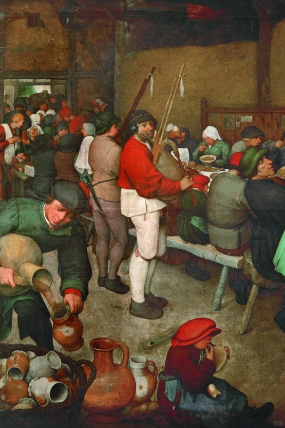 画作描绘了举办婚礼喜筵时的热闹场面,是一幅全面真实地记录尼德兰农村社会场景的风俗画。画面上,没有特别标识主次人物,只有婚礼上热烈的气氛以及人们吃喝的场面。虽然杯盘中的食物并非山珍海味,他们却心满意足。画家抓住了典型场面,通过写实主义手法,通过典型的构图,对众多人物的精心刻画,以及色彩的多层次运用,表现出热烈的气氛,整幅画给人以深刻的印象。