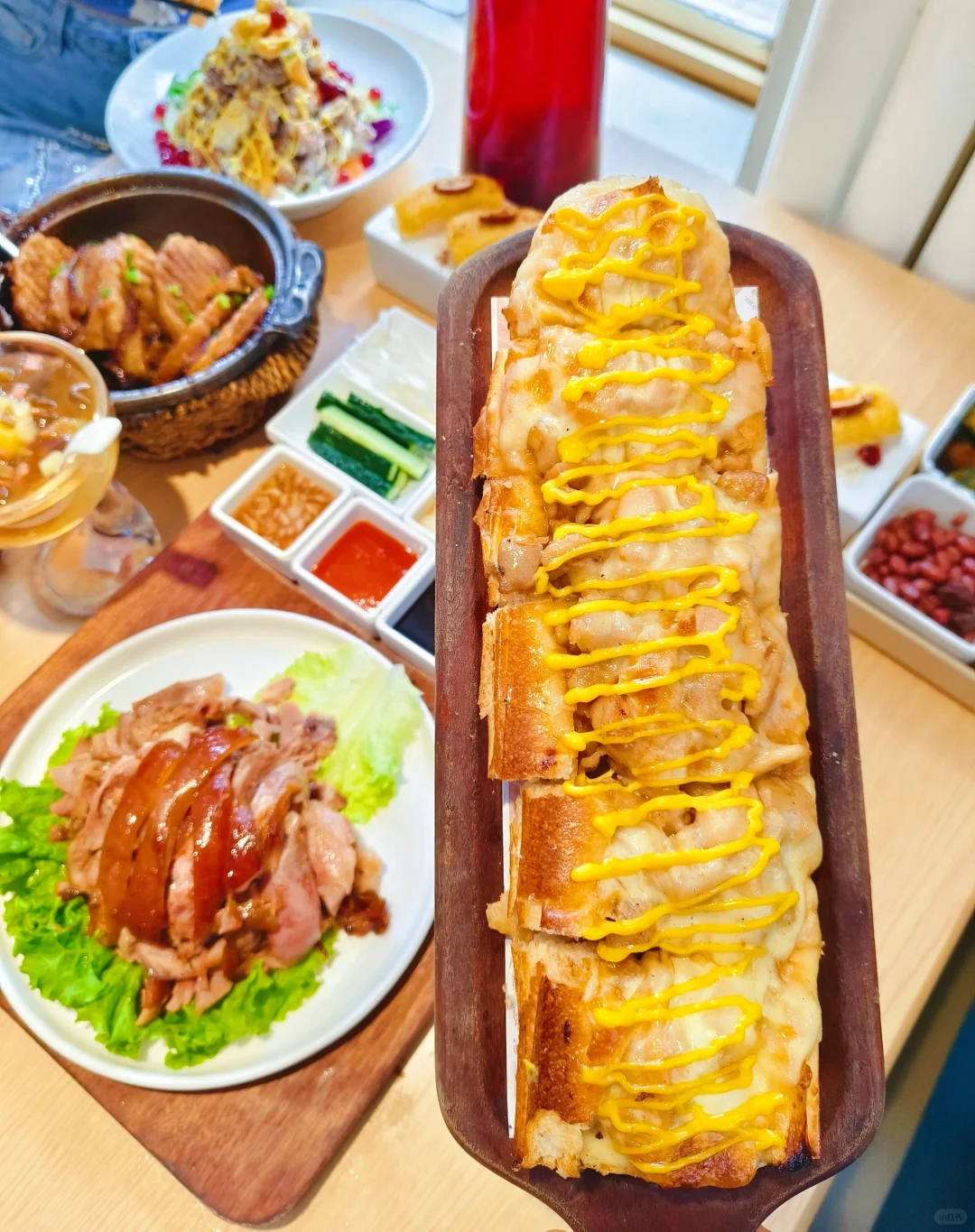 除此之外,他家还有很多创意菜,光听名字就很有意思:不安分的老油条、宫保鸡走一条路。我们还点了青岛人餐桌上必备的海肠捞饭。建议一定点一个蜜桃乌龙冰粉,超级解腻,冰冰凉凉和夏天很配哦