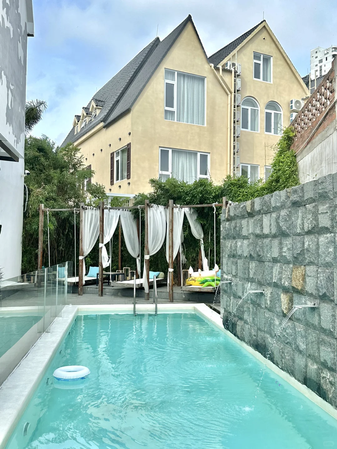 民宿还带有泳池,还有躺着的椅子💺下午不晒的时候可以去游个泳🏊再喝着民宿的下午茶🍵真惬意