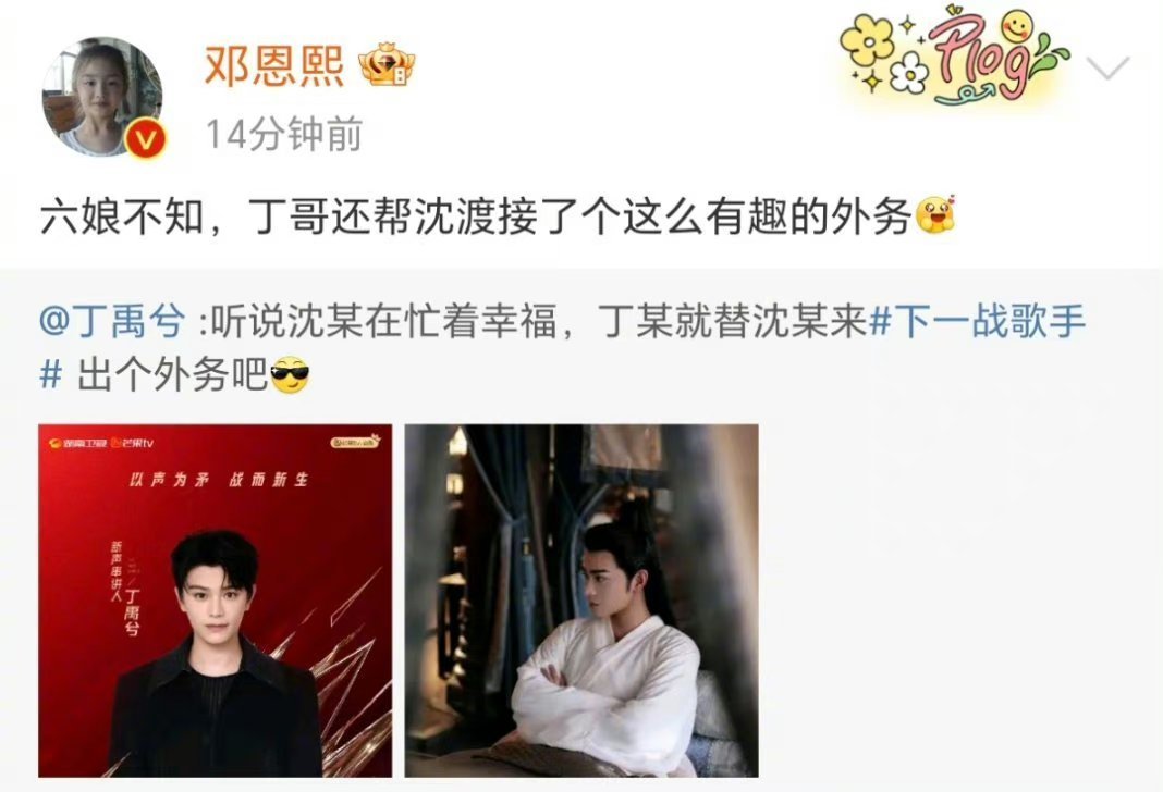 #邓恩熙给丁禹兮打call#邓恩熙发博为丁禹兮打call~“丁哥还帮沈渡接了个这么有趣的外务”,联动🈶了,三沈有幸又幸福住了[doge][doge]!期待新声串讲人丁禹兮正式和我们见面[绿丝带]#三沈有幸又幸福了#