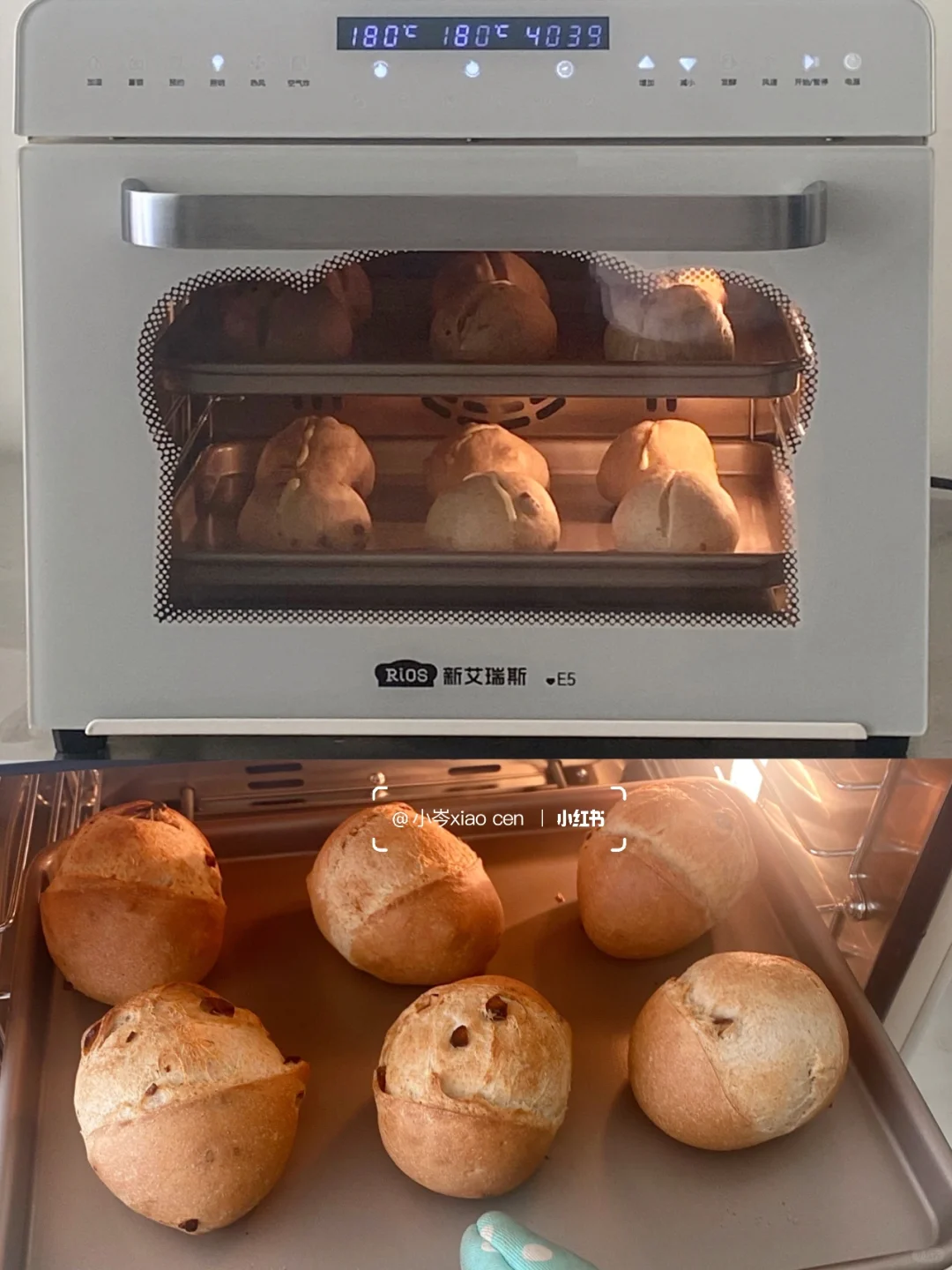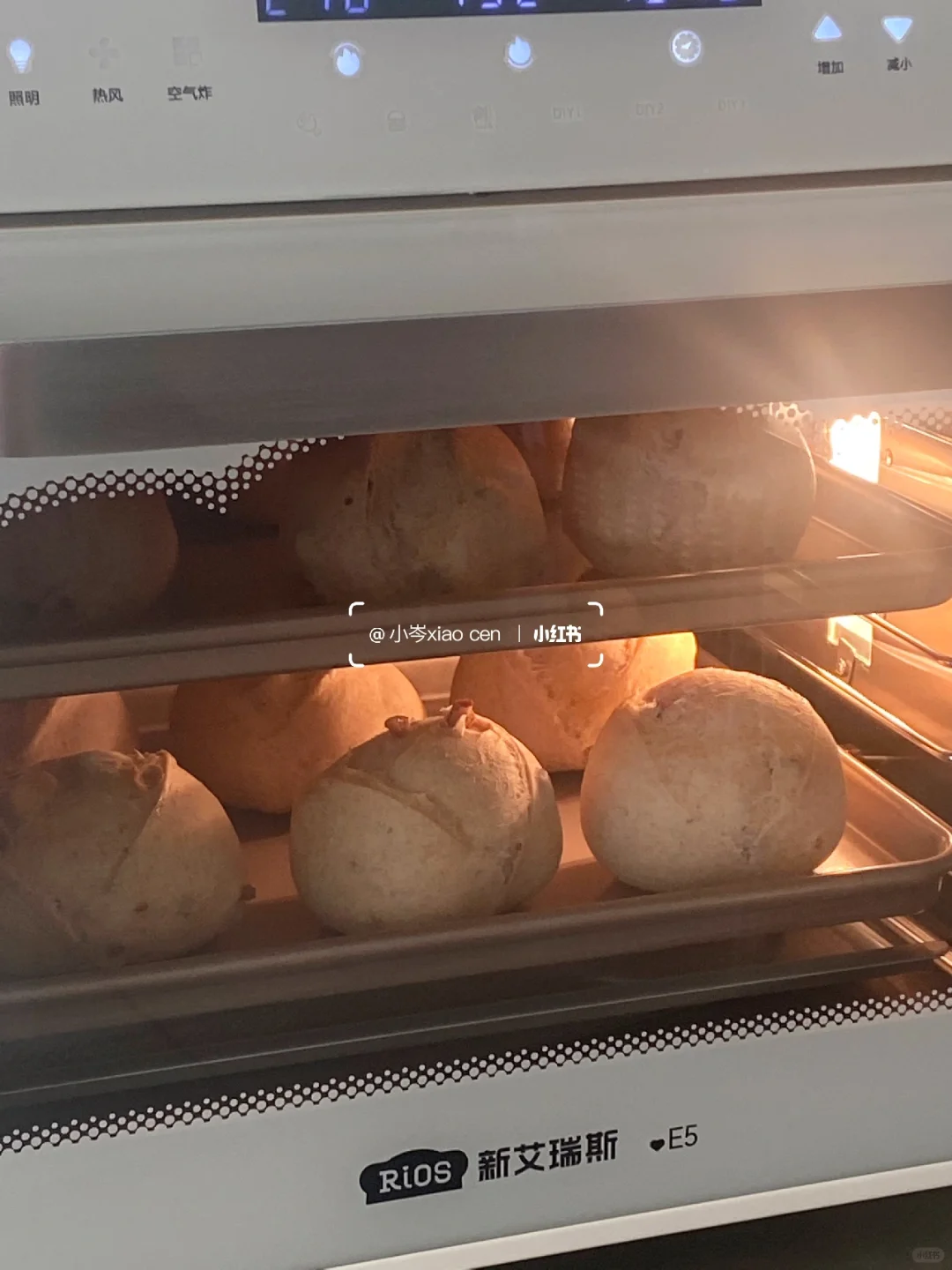 8.烤箱,风炉模式,200度,烘烤15-18分钟左右,平炉200度,20分钟左右。新艾瑞斯E5烤箱,采用M型发热管,热量分布均匀,上色稳、控温稳,烤好的面包非常漂亮!