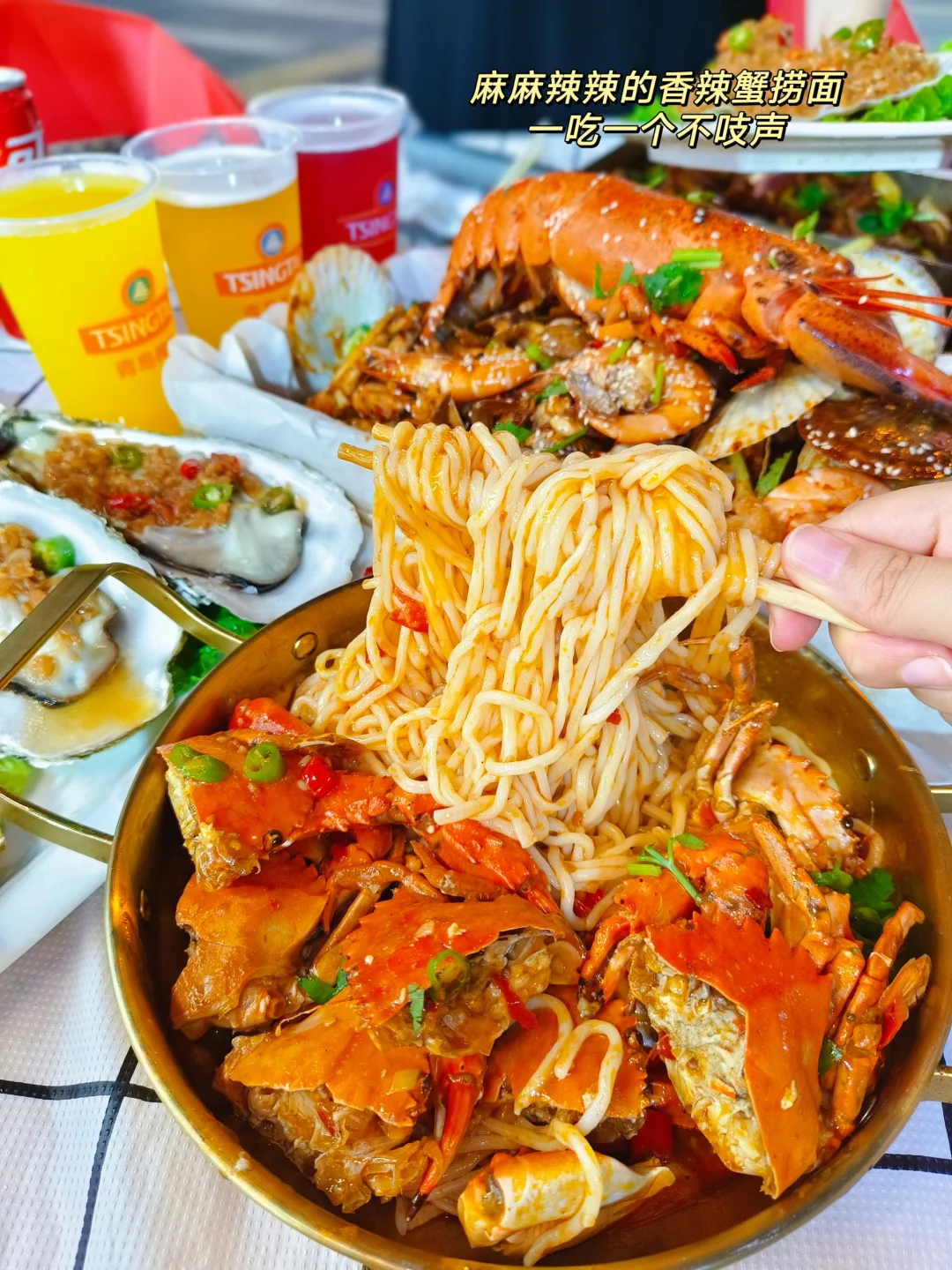 感谢好客青岛不骗之恩,这是我在青岛吃的最满意的一顿,心愿清单已完成!想吃的都吃到啦 ✔乌啦啦同款戳子肉:乌拉拉果然没骗我,青岛人爱吃的戳子肉真的是绝,只要能想到的,老板都能给你戳出来。当然最好吃的还是戳五花肉!很好的下酒菜跟青啤可太搭啦 ✔带籽的大螃蟹:秋天的蟹子可真的是肥,各各都带籽,不需要任何佐料,蒸出来蘸点醋就超级鲜! ✔香辣蟹捞面:麻麻辣辣一吃一个不吱声,被吸满汤汁的面可太好吃啊,嗦面的快乐谁懂 🍺最后的最后!一定要点杯鲜啤,冰冰凉凉的口感再配上海鲜和戳子肉,简直不要满意!