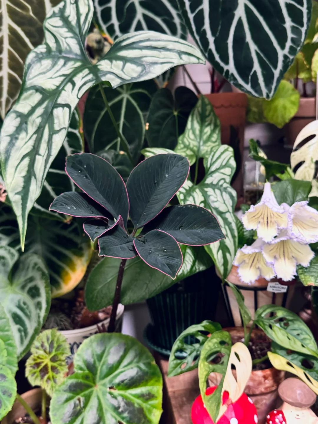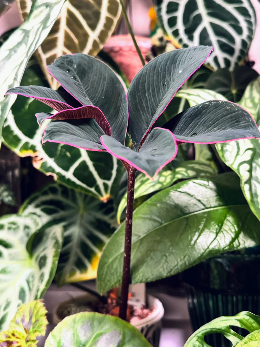 还是21年买的这颗巫蛊百合 怎么三岁了开裂这么少啊 别人家不是这样子 都开成了一把花伞了 怎么我的还是这么几片叶子[生气R] 好在玫红色的边边颜色很强烈明显 不然我要气晕过去了 叶片的颜色是黑色丝绒质感 整个叶片的描边是亮眼的玫粉色 杆子上会有不均匀的白色波图案 是棵很独特也很有特色的植物 天一冷就是个土豆子了 比海芋更像土豆🥔 ———