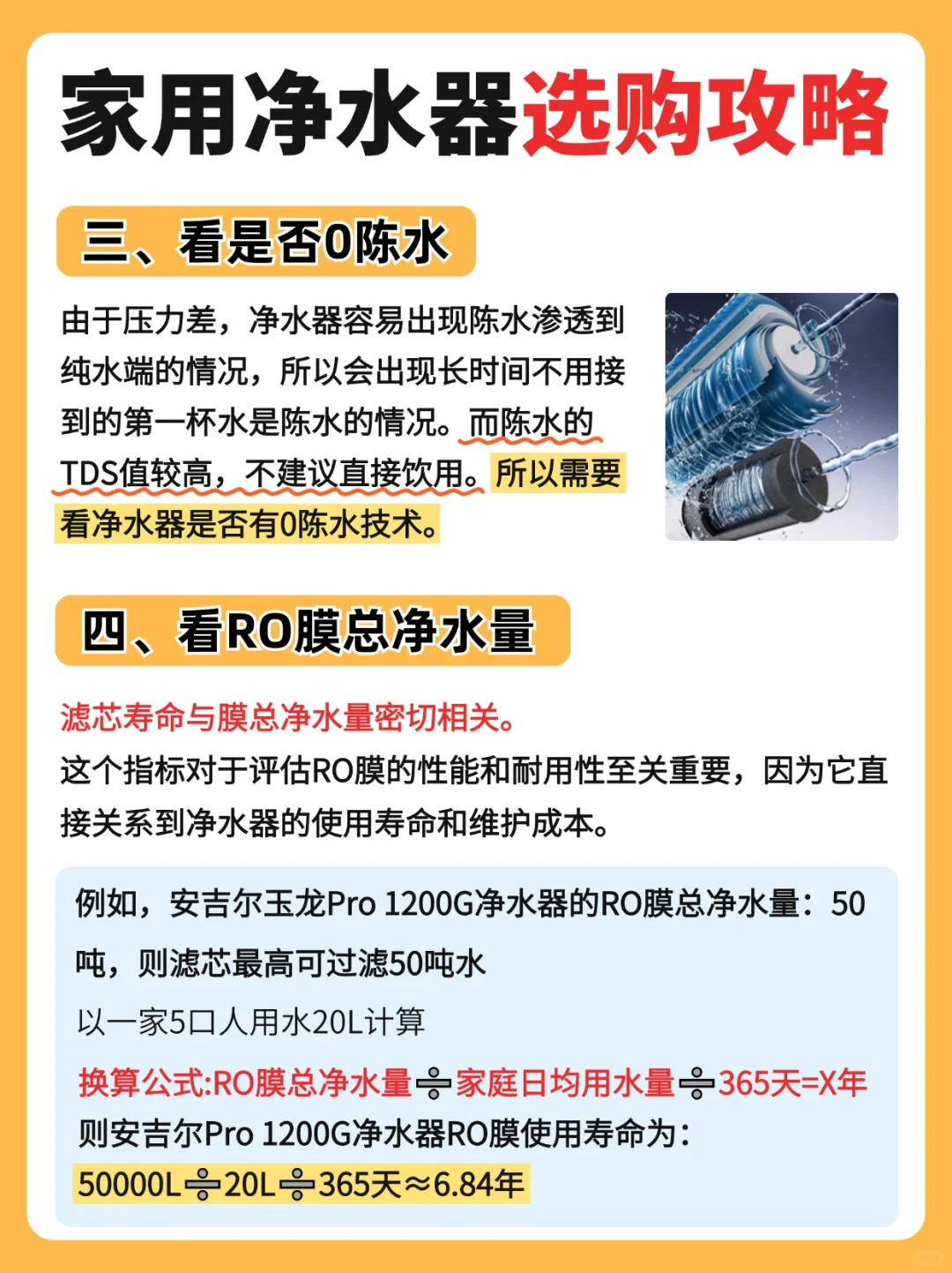 这里有一个换算公式:RO膜总净水量➗ 家庭日均用水量➗ 365天=X年