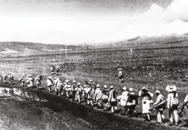 图2:1949年9月,新疆和平解放。图为进军新疆的部队徒步行进在戈壁滩上,当时交通工具缺乏,仅有的一点公路路况极差,部队沿途要经过荒无人烟的茫茫戈壁、沙漠,翻越雪山峻岭