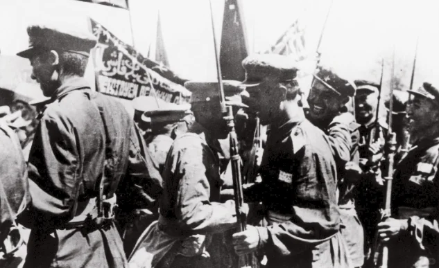 图4:1949年9月25日上午,陶峙岳代表新疆驻军10万官兵通电宣布起义,图为当天人民解放军进疆部队受到新疆当军民热烈欢迎