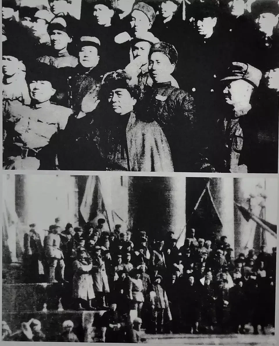 图6:新疆党政军领导和各族各界代表在阅兵台上(今南门“大银行”)检阅部队