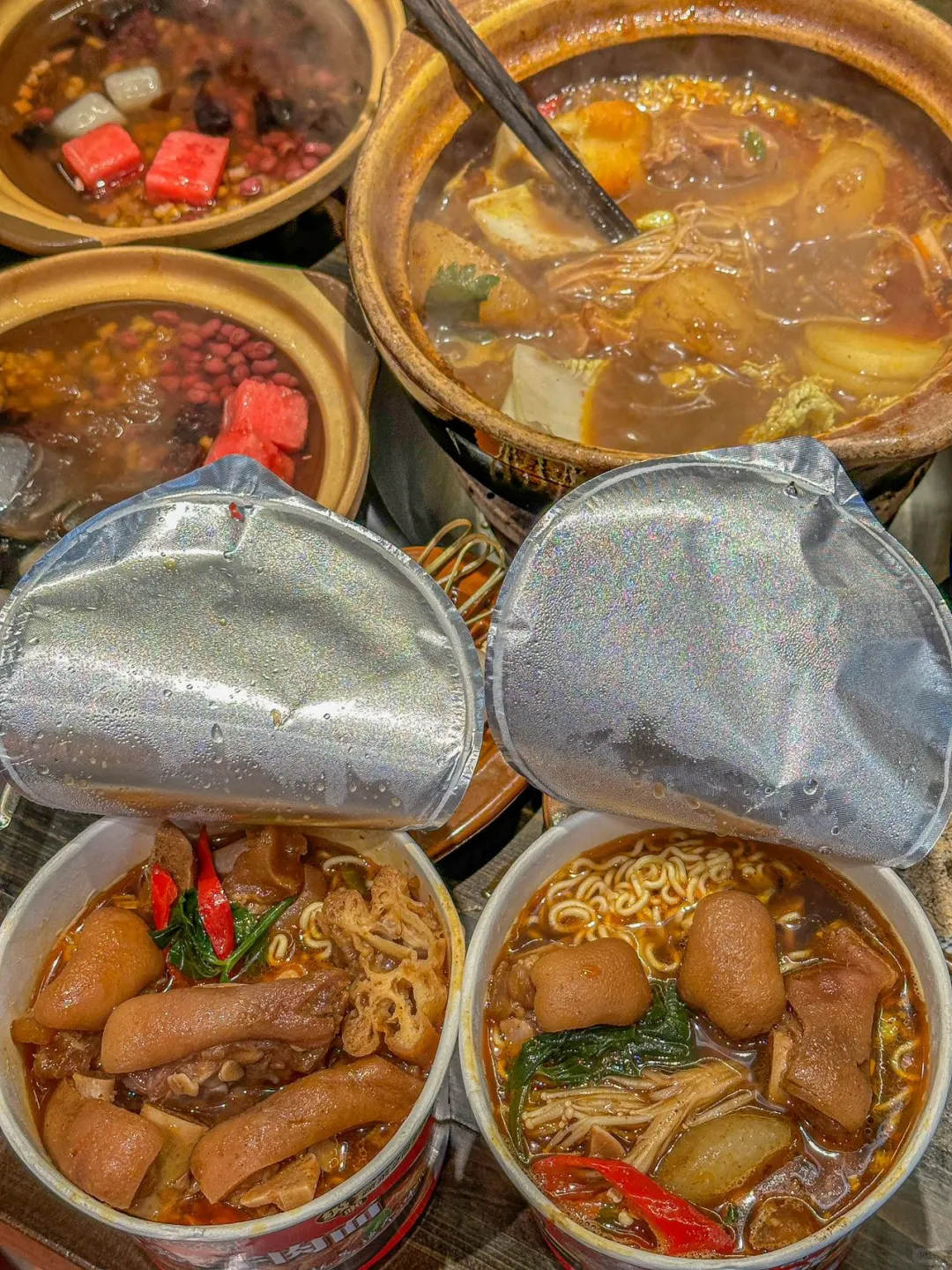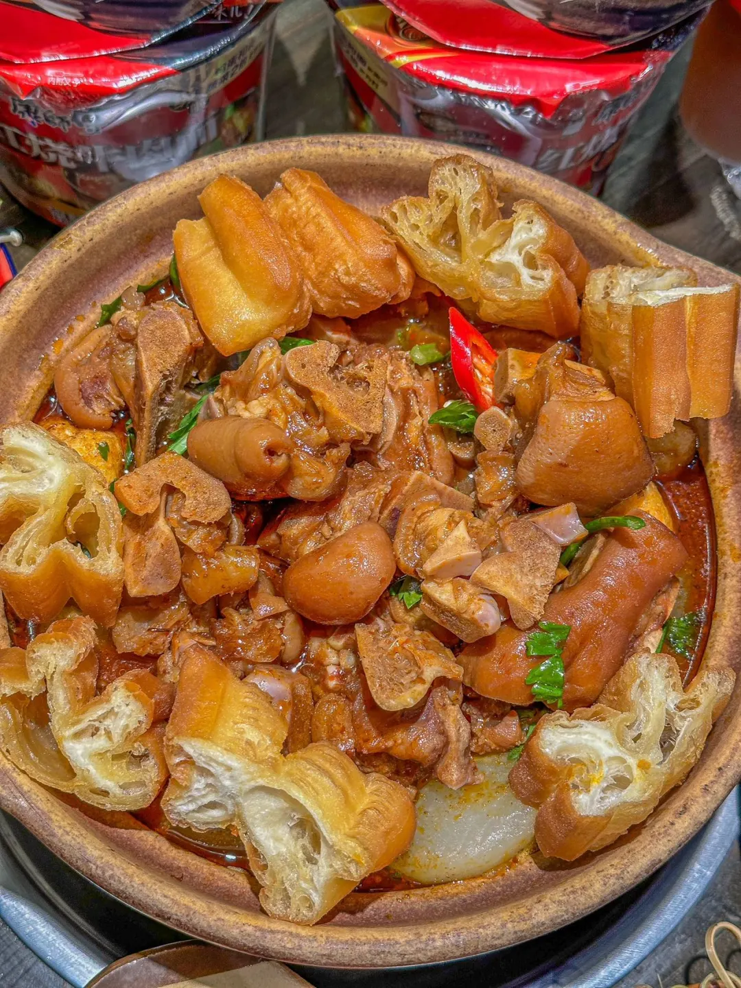 终于吃到了!心心念念的猪蹄煲! 就在滨江天街!位置很好找! 性价比超级高,好吃实惠还不贵‼️ ✔️秘制猪蹄煲 满满一大锅,端上来的时候热气腾腾 里面的料真的好多啊 猪蹄炖煮的很软烂,满满都是胶原蛋白 肉质鲜嫩美味,好好吃啊🤤! 还可以往里面放入自己喜欢的菜品 蔬菜🥬、菌菇、土豆、油条…… 也还可以DIY!把满满的料倒入泡面🍜里 一口泡面一口猪蹄也太满足了吧!!!