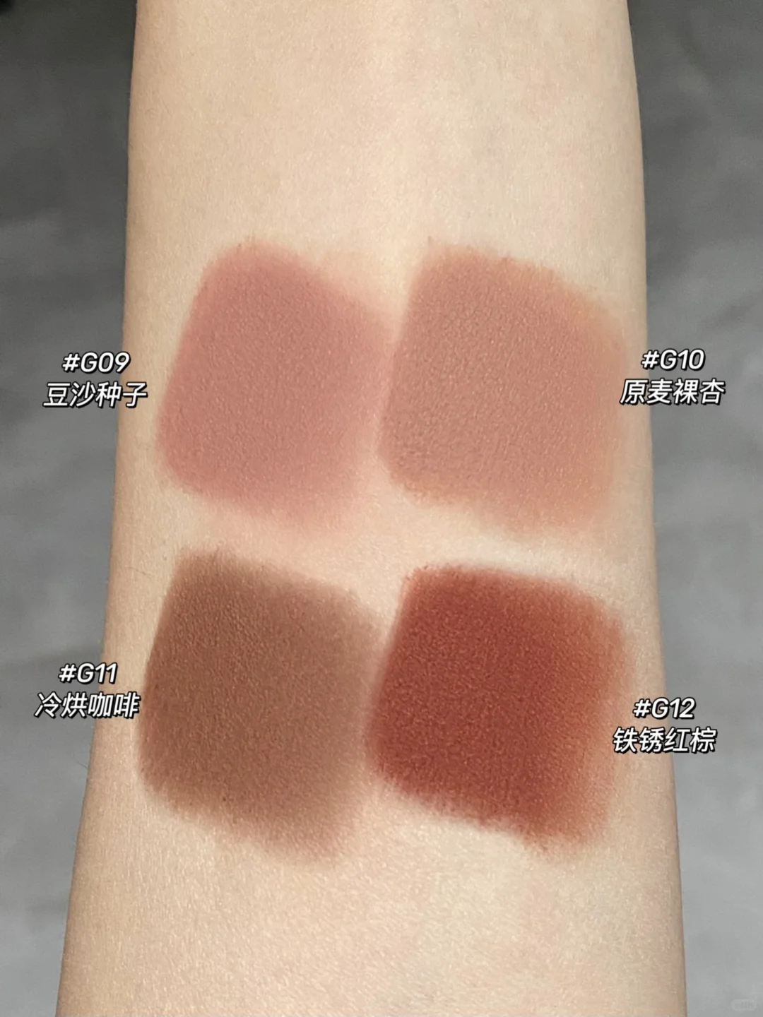 戈戈舞小圆瓶唇泥出新色啦! 胖嘟嘟小圆瓶5G入秋! 这次四支都是超级适合秋冬的绒雾泥! 🤎G09 豆沙种子 韩杂无花果泥 早秋裸色不挑皮 🤎G10 原麦裸杏 低饱和裸调杏茶棕 ins亚裔感 🤎G11 冷烘咖啡 摩卡咖啡棕 美拉德拽姐拿捏 🤎G12 铁锈红棕