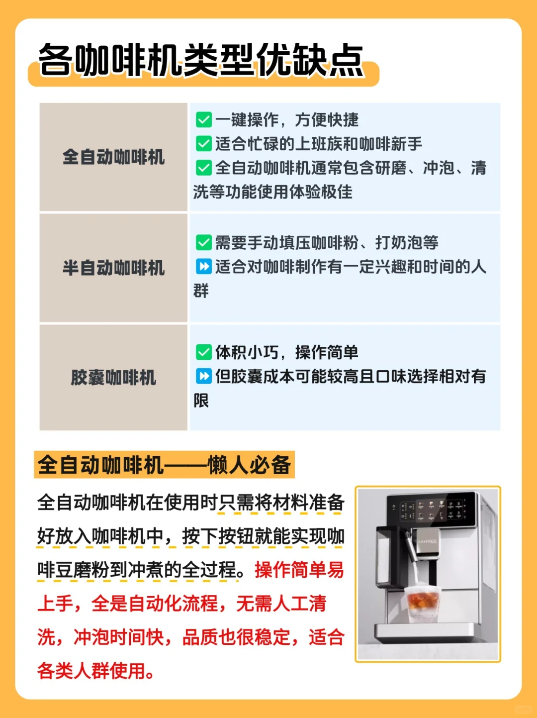 我列举了市面上比较常见的3️⃣种咖啡机:其中全自动咖啡机自动化流程操作易上手,无需人工清洗,冲泡时间快,品质稳定,适合各类人群使用。