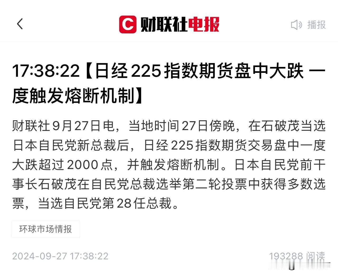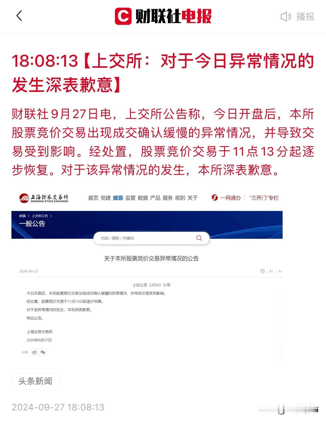 刚刚,上交所就今日“宕机”正式道歉!股民:错过好几个亿。盘后,三个重要信息: 1、今天上交所交易拥挤出现系统宕机,下午也没有完全恢复,盘后正式回复了。 上交所对造成的影响深表歉意,认为上午十一点多开始慢慢恢复,但实际上很多人下午也没办法买入和撤单,所以对股民朋友的影响还是比较大的。 关键是道歉能否弥补系统崩了造成的影响?大家愿意接受吗?#上交所宕机了# 2、今天盘后日经225指数期货出现大跌,一度出现熔断现象,对A股会有影响吗? 现在欧美股市和日韩股市哪怕持续大跌,可能都不会影响到A股市场,这是因为这次A股反弹是典型的政策底,是超预期的宽松放水带动市场的上涨。 日经指数期货的大跌,一方面是因为日本自民党前干事长石破茂在自民党总裁选举第二轮投票中获得多数选票,当选自民党第28任总裁。这会引起市场对未来不确定性的担忧。 另一方面也有不少资金正在逐步撤离开始准备转向A股市场,这轮反弹很多外资直接改变预期,速度也是比较快的。 现在外围市场相对A股来说都是处于高位,不必担心外围市场表现对A股会带来冲击。 3、盘后富时A50指数出现回调,下周一还能继续涨吗? 今天盘后A50指数期货出现回调了,不过幅度不是太大,其实今天白天A50指数期货就从大涨转为快速回落,市场波动情绪较大。 主要是最近四天A50指数期货反弹涨幅超过了20%了,短期涨幅较大,存在一些短线资金兑现离场。 对于本周来讲,创业板指数也是从底部上涨超过了百分之二十,也进入技术性牛市了,而且今天单日上涨幅度和成交额均是创下了历史记录。 所以短期一旦市场涨幅过大存在回调修正的话,这是技术上正常现象,目前大量踏空资金等待是比较着急的,不担心会有大跌出现,下方资金承接意愿很强烈。 对于下周一股市来说,节前最后一个交易日,就算是卖出离场也无法出金,意义不是太大,所以市场预计不会有太大的抛压。 另外,从做多的角度来讲,这个周末情绪继续发酵,下周一预计还会有很多资金进场。 因为担心假期还会有超预期政策利好出现,所以原本打算空仓过节的资金可能也会考虑重新持股过节-)也有助于市场继续向上走。 不过,考虑到各大指数短期涨幅较大了,下周一指数预计涨幅有限,更多的是个股补涨可能会延续下去。 还是那句话:牛市看情绪! 关注我,时间会给你最真实的答案@云帆观市 #A股大涨# #石破茂当选自民党总裁 将任日本首相#