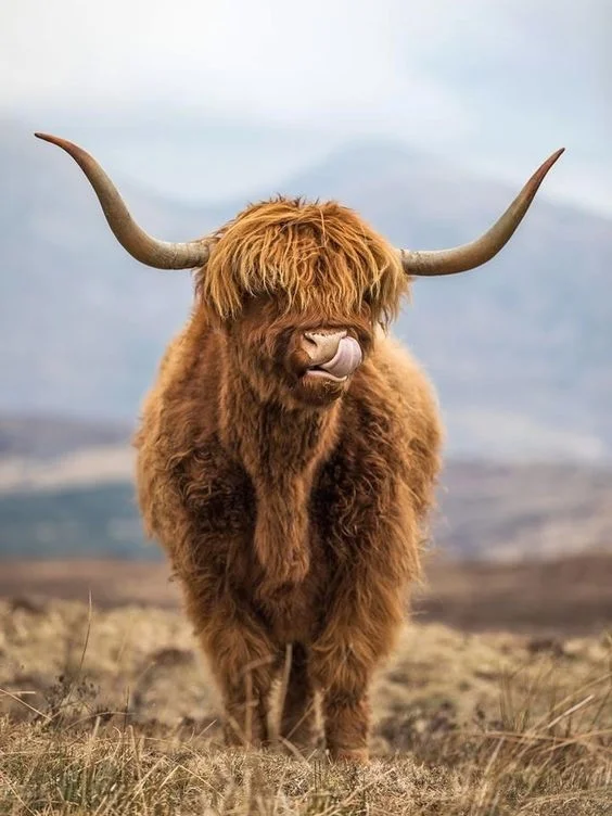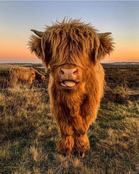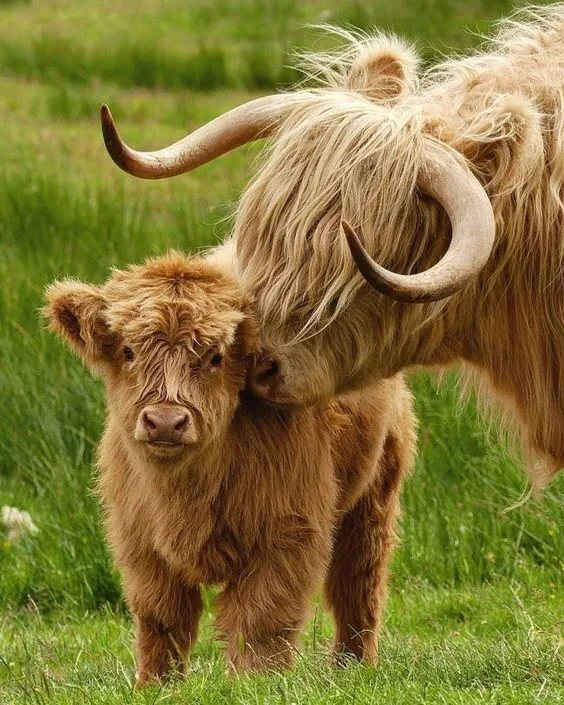 🍀苏格兰高地牛是大型偶蹄类动物,全身披着金红色长毛,特别是头顶的长毛披下来,就像盖住眼睛的刘海。它们是一种古老品种,身体健壮,能够消化其他很多牛回避的植物,长长的毛发则帮助它们经受住严寒和大雨的考验。