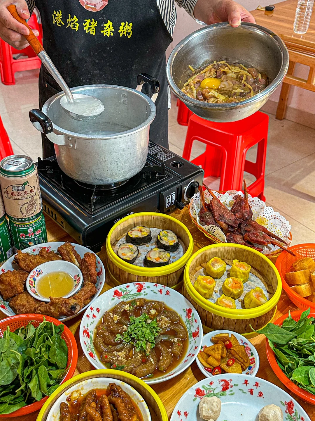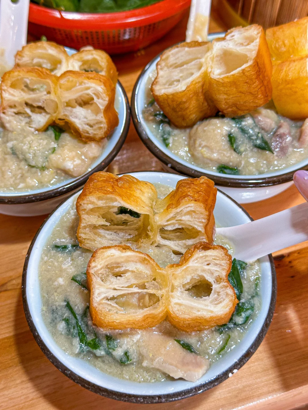炸虾饼 大排骨!和我在汕头吃的一模一样 粥里加两块油条 贼香!锅气十足的街边边小店… 猪杂粥是招牌 来这儿就馋这一口 新鲜的猪杂自选 种类很多 ✔️猪肠✔️猪肝✔️猪肺✔️猪肚✔️猪肉… 粥底里煮一煮再加入一个鸡蛋 喷香 油条是灵魂 摆上两个绝咯