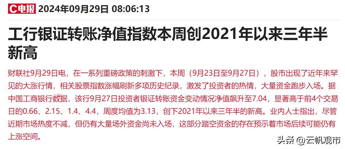 万万没想到,上交所启动的全网测试,股民朋友竟然参与不了,由券商替股民朋友模拟下单,股民朋友是白激动了!工行银证转账指数大涨,还有大量踏空资金要来?一起来看分析: 1、首先,今天可能要让全体股民朋友失望了,因为今天开展的上交所全网测试,股民朋友是没办法参与的。 可是根据昨天上交所的公告,不是邀请全体市场参与人进行测试吗?没错,但是因为股民的交易都是通过券商系统来进行的。打个比方,券商就是股民的“代购”,“代购”替你模拟下单就行。 所以全部都是由券商来替股民朋友进行模拟交易了,这下真的让大家又学到了。 股市大涨要赚钱的时候,上交所宕机,结果股票都买不到; 上交所测试市场“爆单”场景,券商又代替了股民,股民朋友完全没有了代入感; 这是害怕股民朋友对股市热情太高了吗?还是担心大家太过于疯狂,导致测试可能都会全部涨停的情况? 不过,虽然股民通过券商交易下单,但是券商毕竟不能完全代表股民朋友的情绪,测试的结果可能和实际上也会有较大的差异; 2、其次,今天工行银证转账净值指数或意味着接下来行情还将继续火爆下去: 据中国工商银行数据,该行9月27日投资者银证转账资金变动情况净值飙升至7.04,显著高于前4个交易日的0.66、2.15、1.4、4.4,周度均值为3.13,创下2021年以来三年半的新高。 直到工行公布了这个数值,很多人才知道原来还有这样的指数,这是不是意味着大数据之下,大家的底牌其实被看的一清二楚了呢? 最近一段时间市场比较火爆,银证转账的资金量也是大涨,毕竟大量的股民需要把钱转移到证券账户,这个时候银证转账净值指数就代表市场对于后市看涨的热度,毕竟没有信心的话也不会把钱转移到股市。 根据一些专业人士通过数据判断,预计还有大量的踏空资金可能会跑步入场,这对于后市来说是一股强大的做多力量,股市预计还会有上涨的空间。 3、最后,再说一个利好消息,央行今天进行1820亿元7天期逆回购操作,中标利率为1.50%。 之前7天期逆回购利率是1.70%,现在下调20个基点,体现出央行继续降息的预期,另外央行周末开展逆回购操作,继续维护市场流动性宽裕,有助于股市继续走高。 (1)从这段时间政策面来看,多部门持续的释放利好,是支撑A股市场走牛的关键; (2)从情绪面来看,现在内外机构持续看好,观望资金开始入场,开户数量大涨,意味着增量资金也准备入市,大概率还没有到结束的时候; 而对于明天节前最后一个交易日来说,很多人还在考虑要不要全仓进去,这说明信心都已经回来了,如果市场真的要套人的话,那也是要等待资金都入场之后,现在还有大量的资金没有入场,就算是拉高找人接盘,时机也是不合适的,所以继续看多才是主旋律。 关注我,时间会给你最真实的答案@云帆观市#A股大涨后第一批受益人出现了##A股狂欢这四天100万本金能赚多少钱##专家:牛市行情呼之欲出##是否可以取消调休##你赞同取消调休吗?#