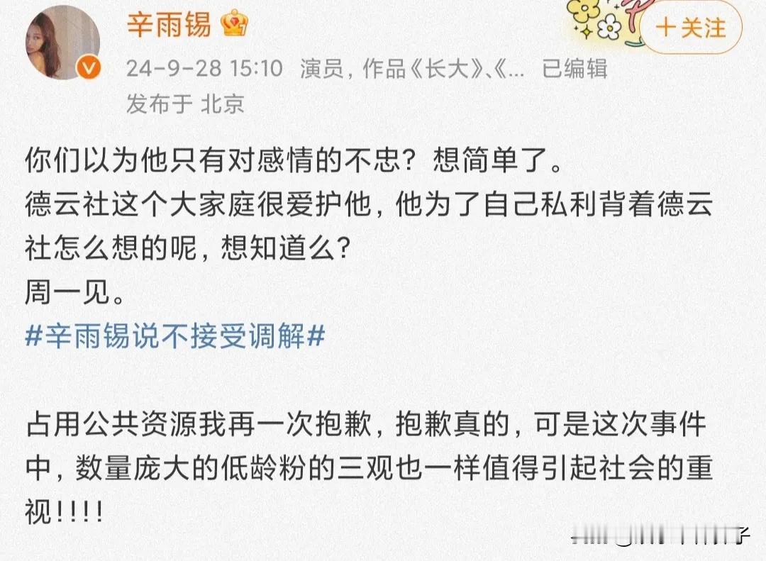 郭德纲,这下要闹心了吧! 9月29日,辛雨锡再次发文,爆料秦霄贤孕期出轨,并晒出两张截图。 其实,不管咋样,都是两人交往时候的事了,到底孰对孰错,很难说,更何况,秦霄贤一直没回应,真假难辨。 然而,看到辛雨锡发布的另一条博文,这个有点狠了,要爆料与德云社有关的事,还用了背叛这个词,这……! 而且,辛雨锡还在评论区留言,看这架势,铁了心要爆料,到底有什么大瓜,9月30日,就能知晓了。 话说,感情的事,属于个人私事,郭德纲可以不管,然而,如果跟德云社有关,还牵扯到爱徒,还能有视无睹?估计要闹心了吧。 不得不说,有些徒弟,真不让老郭省心呀!