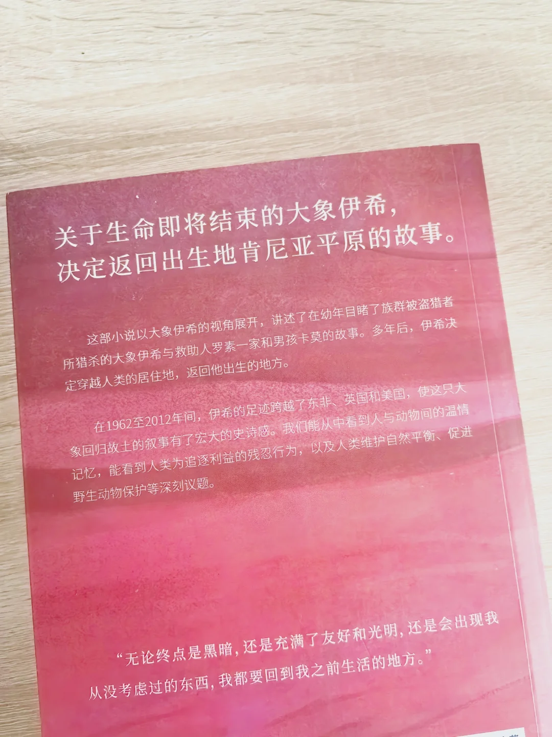 故事的主角伊希,是一只经历过背叛与痛苦的大象🐘。年轻时,它看到自己的家族被偷猎者屠杀,然后被善良的罗素一家救助,从此开始了孤儿生活。书中穿插了伊希从非洲到英国,再到纽约的五十年旅程。当它决定在生命的最后时光,回到故乡时,那种对故土的思念和对生命的反思深深触动了我💔。