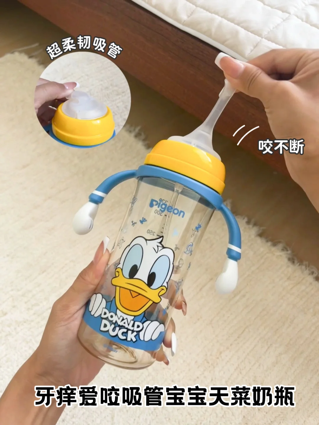 吸管贴合宝宝口腔吮吸运动的样式,就算是50度水泡奶倒置都不带喷一点!