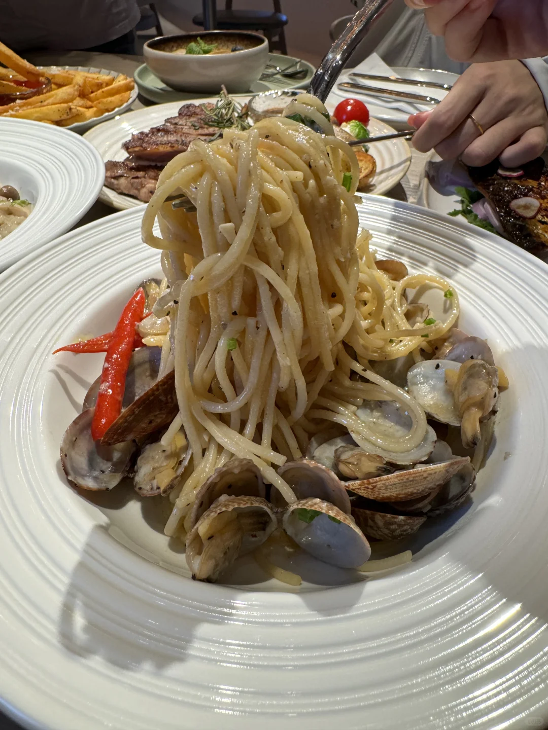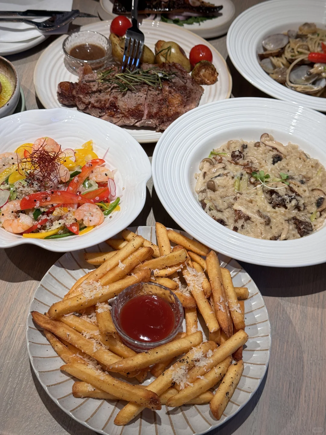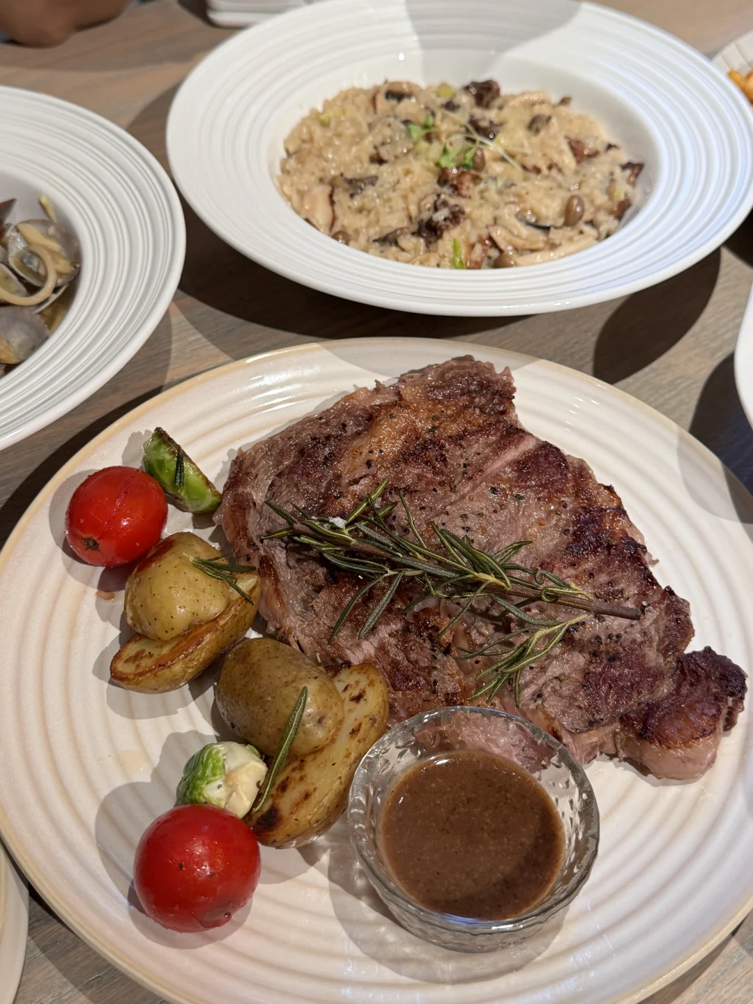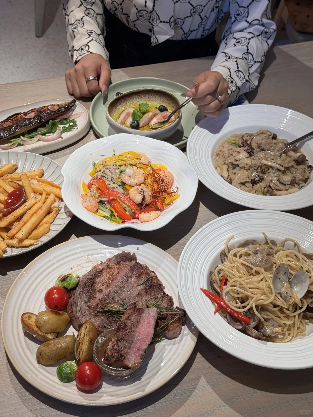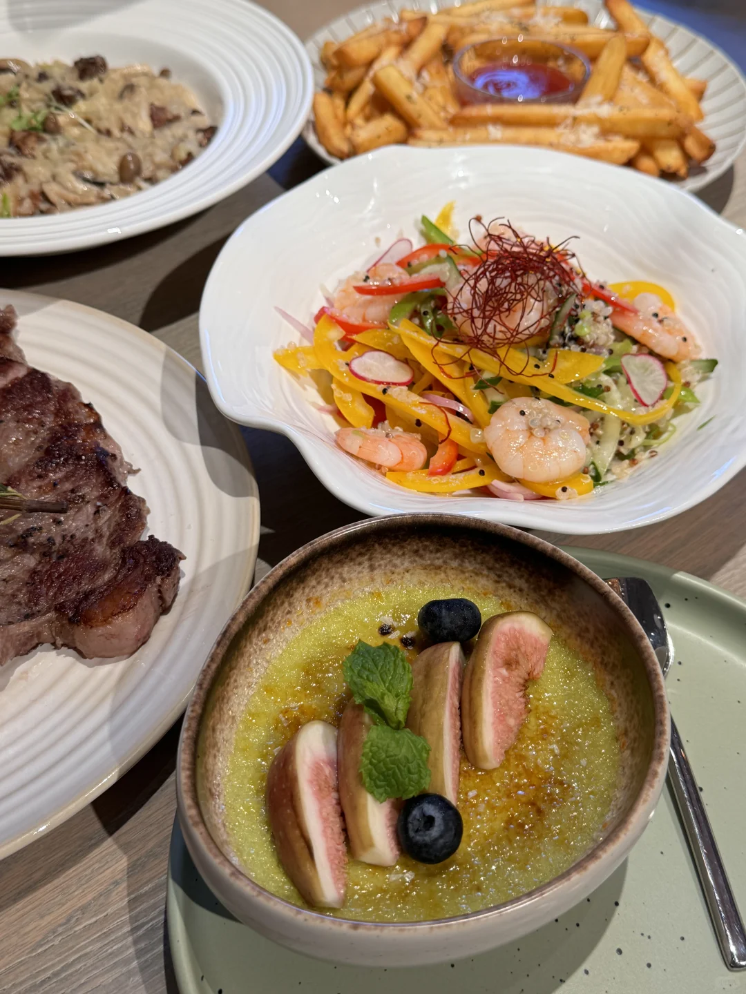 - 独栋的三层小楼,环境很好。有下午茶有餐,很适合小座。 点了牛排、沙拉、意面都很不错,牛排汁水丰盈。纸包奶油鸡也很特别,鸡肉很嫩。海盐焦糖斑斓布雷,很细腻不会很甜,有股斑斓的清香