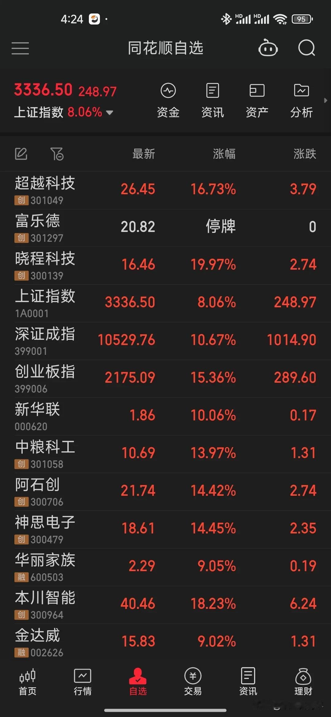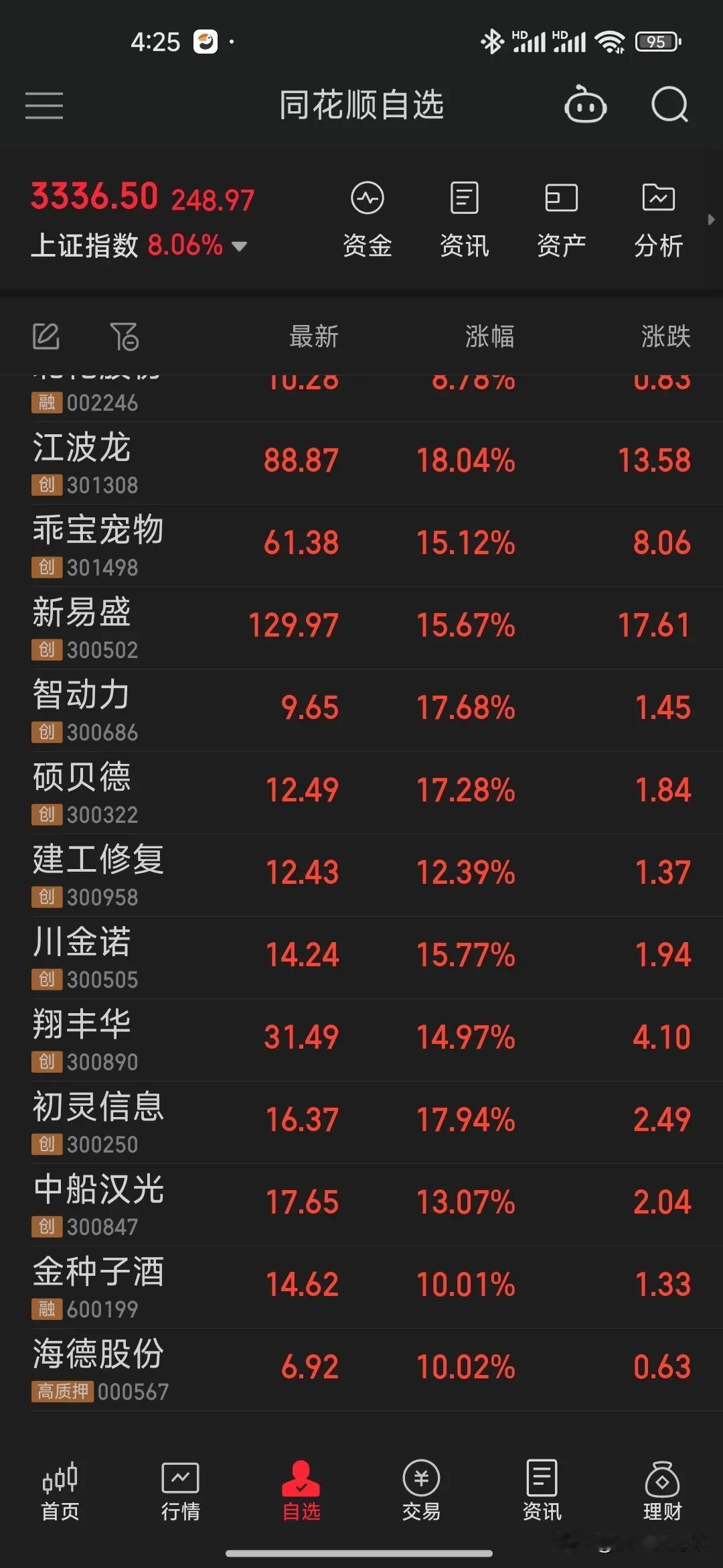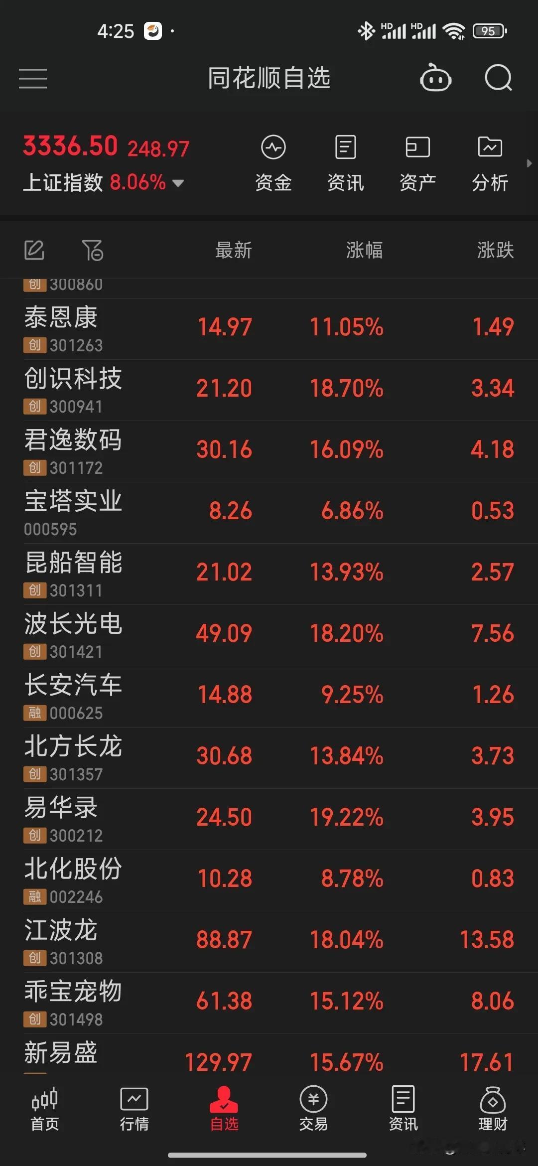 中国股市今天杀疯了🔥,股民今晚应该都激动的睡不着了。 大盘大涨8个点,瞬间就上3300,创业板甚至大涨15个点,以前这么强的时候还得推到2008年和2014年了。身边的朋友都开始蠢蠢欲动了,有的从银行把死期存款取了出来准备入市,有的注销了好几年的账户重新去证券开户了,股民的热情起来了,但是奉劝各位一定要伺机而动,想想08年之后的股灾,不要好了伤疤忘了疼,最后得不偿失,不要全仓,要有回手。 今天涨的太疯狂了,疯狂到简直不可思议,有可能是庄家急拉,带一波热情后就开始收割,所以股民一定不要贪,选股的时候一定要选热门股,盈利就撤,让我们静待牛市开启!