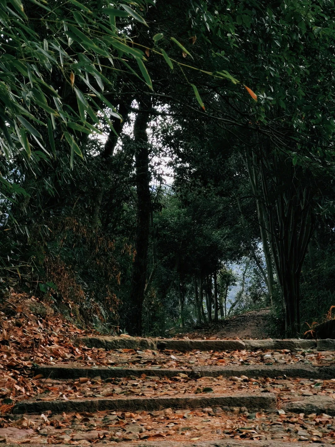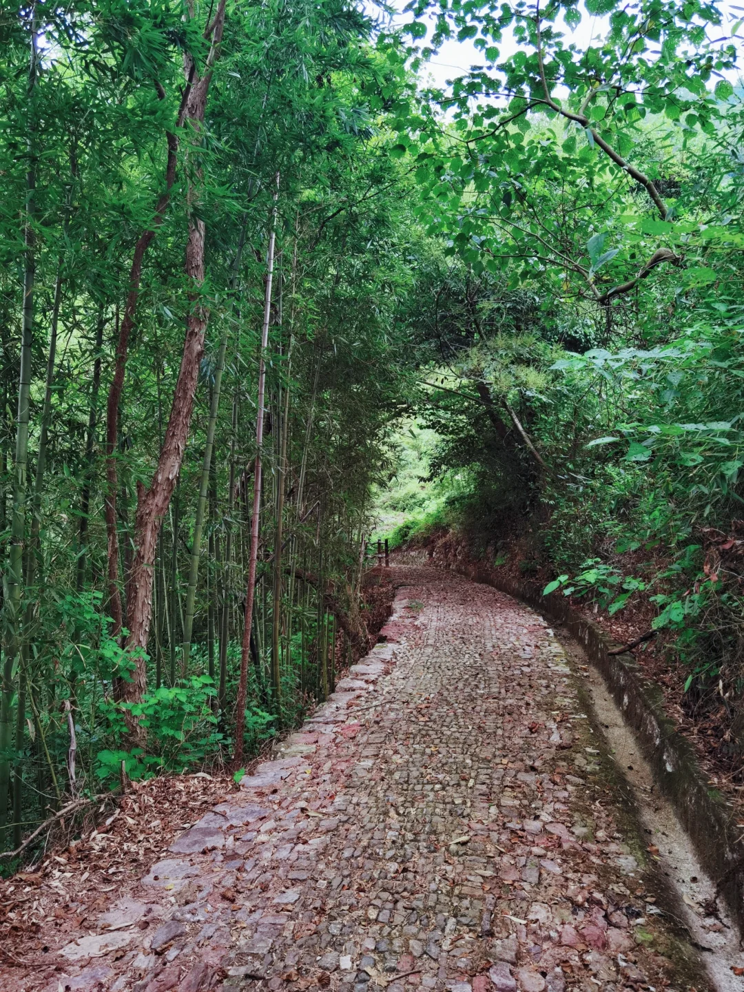 进入入山亭后,上山古道依山势而辟,石蹬层层蜿蜒峻陡。南侧可一览众山小,青山连绵长蛇阵,回望可见资福律寺。一路都是鹅卵石铺路,线路清晰,几乎无叉路,爬升203米,耗时1h,六只脚轨迹:8290588,挺适合小白亲子徒步。