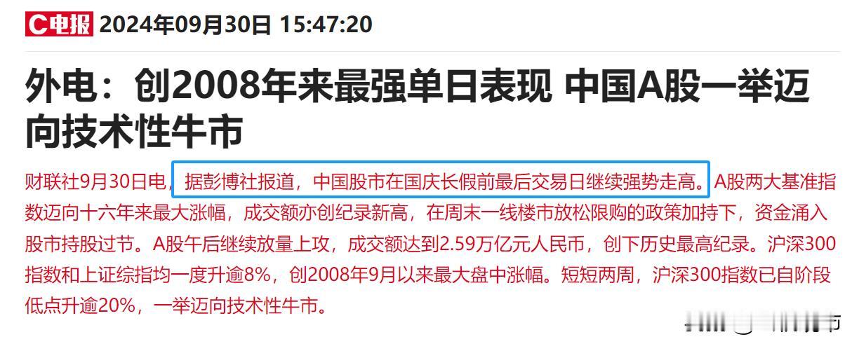 万万没有想到,A股涨到人民日报发文力挺股市,中央汇金人事变动,连外网对A股都惊呆了: 1、今天A股大涨,盘后人民日报第一时间发文推送A股创造历史记录。 人民日报盘后发文谈及A股全天成交额超2.6万亿元,创历史新高。人民日报已经很久没有针对股市发文了,周末发文谈及提振信心,努力实现全年经济目标,今天A股市场全面普涨。 人民日报又在盘后第一时间推动股市消息,足以看出现在的A股市场上涨是全民所期待的,也是官方所支持的上涨。 所以,这样的量价齐升上涨并非是空穴来风,也并非是情绪跟风效应,可以理解为是一种大势所趋,是央行等多部门联合调控的结果,这样的上涨至少是健康的。 2、今天盘后有一则人事变动消息引起了注意,中央汇金公司换新人了。 根据最新消息来看,中央汇金公司副董事长和执行董事换新人了,中央汇金作为某队的先锋力量,总是在股市低迷的时候力挽狂澜救市。 去年年底汇金带头抄底四大银行,这次A股市场可以从底部反弹,也离不开汇金的资金支持,今年以来汇金大量的买入股票ETF,尤其是在市场下跌的时候逆势买入沪深300ETF等权重,掌握了不少的底部筹码。 现在A股市场正处于牛市行情阶段,汇金出现了人事变动,也引起了市场的高度关注,这可能意味着接下来汇金在股市要继续发力了,尤其是投资端,新人新气象值得期待。 3、今天A股大涨也惊动了外围资金,彭博社发文谈A股创2008年以来最强单日表现。 其实今天A股市场创下了很多历史记录,比如: 创业板单日涨幅创历史记录,5天涨幅42%; 沪深两市成交额突破2.59万亿,创历史记录新高; 沪深成交额35分钟突破万亿,刷新历史最快万亿成交记录; 科创50和北证50单日涨幅均是创下了历史最高记录; 深成指单日涨幅创有涨跌幅限制以来记录,单日涨幅超10%; 券商板块40多集体涨停,创历史记录; 今天也是2008年以来A股强单日表现,今日彭博社也报道了A股市场的强势,由此可见A股已经征服了不少的外资机构,现在越来越多的资金正在对A股市场改变看法。 大家也不要觉得市场情绪非常高,风险就会比较大了,大家见过哪次牛市会在3300点总结的吗?对比历史上的任何一次牛市,这个点位其实都还算是属于低位。 4、最后,大家也不要忽略了还有一大批增量资金没有入场呢,这个国庆假期很多券商是不休息的,会加班进行开户。 而且今天还有很多银证转账的资金因为延迟确认没有成功,节后A股市场开市,还会有大量的资金入场,所以A股不会突然结束。 就算是指数涨幅放缓,权重股休息了,那么市场也会进入题材板块轮动的阶段,现在只是牛市初期的爆发,真正的主升浪还没有开始。 关注我,时间会给你最真实的答案@云帆观市#有股民一早上赚52万元##两市成交额近2.6万亿元创历史新高##有网文作者股市已赚300万直接断更#