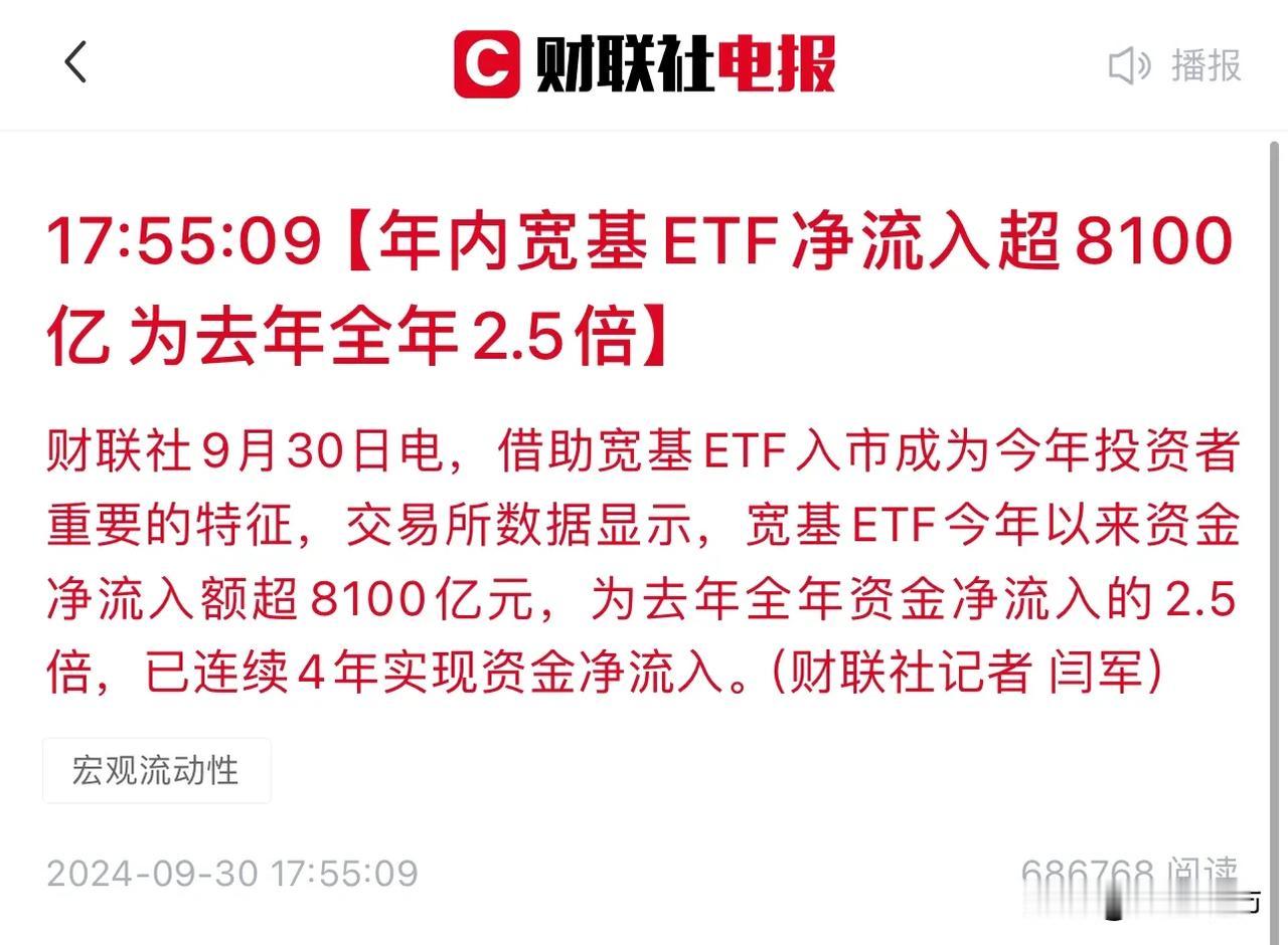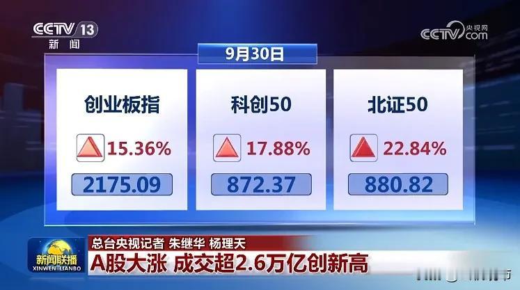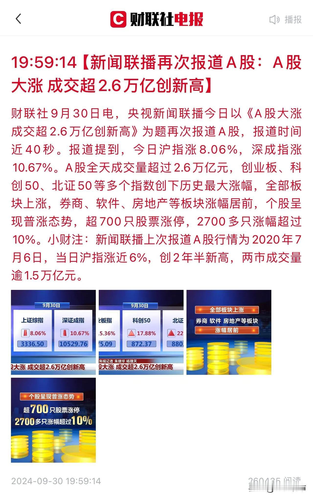 今年最硬核广告,新闻联播再次报道A股,这下全国人民都知道A股是牛市了: 1、今天的A股大涨上了新闻联播,上一次新闻联播报道A股还是在2020年7月6日,当日沪指涨近6%,创2年半新高,两市成交量逾1.5万亿元。 今天大盘指数涨幅八个多点,A股两市成交额2.6万亿创历史新高,明显情绪上更胜一层楼。 今天盘后人民日报专题发文谈及A股创历史记录,晚上新闻联播再次向全国人民表明A股市场的火爆行情。 这下是要让全国人民都知道A股是市场走出了牛市行情,就冲这一点,节后会立刻砸盘吗? 绝对是不会的,现在的A股牛市行情是中国资产的招牌门面,刚要让全球都知道A股市场的行情,怎么会自己砸自己的招牌呢? 所以,现在市场筹码收集的其实还不够,现在还在到处宣扬A股市场的价值,说明还没有涨到位。 从这一点来说,我觉得大家国庆可以安心的好好休息了,节后对于兑现的资金来说完全有机会,对于踏空的资金来说,估计还会有很多资金忍不住开盘继续抢筹。 今天大盘分时两波跳水,其实已经洗出去了不少人,大家也看到虽然有主力资金流出几百亿,但是量能不断放大,买单高价持续抢筹,最终市场还是创历史记录大涨,这就是情绪的推动。 2、今天还有一个数据超出了预期,年内宽基ETF净流入8100亿元,是去年全年的2.5倍,说明什么问题? 大量的资金借道宽基ETF流入市场,其实更多的是国家队资金为主,说明今年一直在抄底。 目前已经是连续四年维持净流入了,这会为A股市场走出长牛打下了坚实的基础。 3、最后,说一下最近市场上减持相关的消息: 大家这两天盘后应该看到不少减持信息,大概有两百多只个股这两天公布了减持消息。 虽然相对于两市五千多只个股来说,这个比例不算很大,但是由于市场持续反弹大涨之后,很多个股股价回升不少,一些股东开始忍不住减持了。 对于这类减持的公司来说,大家要放一放,放一边去不用太多关注了。 行情刚起来了,股价刚刚回升一些,就开始迫不及待的减持套现了,这样的公司会有什么价值呢? 所以,这些减持公告是牛市里的验证,用来判断什么是有价值的公司关键,大家要注意规避,以免浪费了这大好行情。 最后,祝大家国庆快乐,节后继续大赚步步高! 关注我,时间会给你最真实的答案@云帆观市 #新闻联播时隔4年再次报道A股行情# #A股主力资金净流出273.4亿元# #两市成交额破1.8万亿创历史最高纪录# #A股今天诞生六大新纪录# #有股民一早上赚52万元# #A股疯牛太牛了# #A股新纪录!#