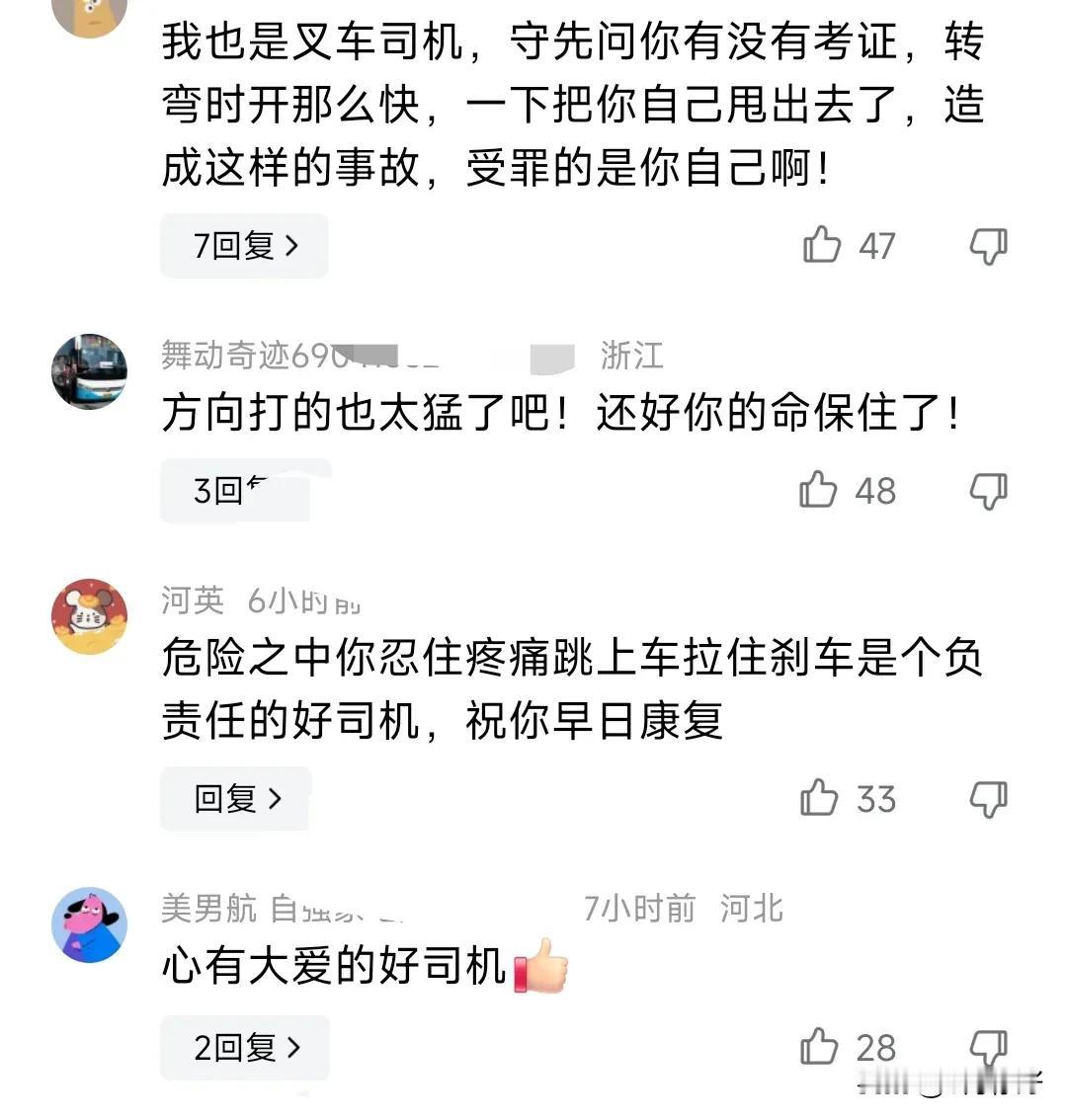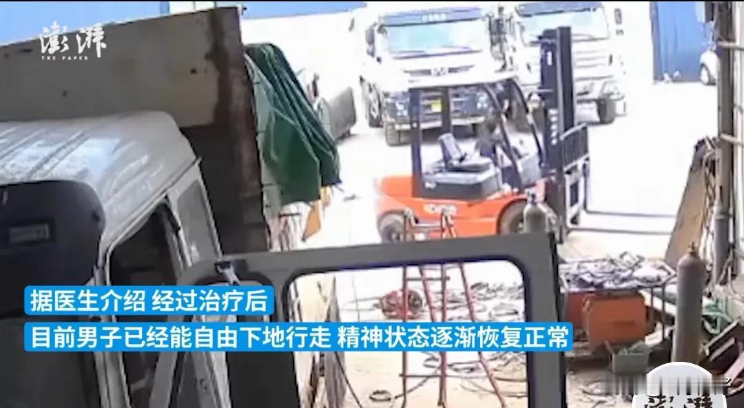 这真的是太危险了。近日云南昆明,一男子是开叉车的,不知道有没有考证,当时叉车的速度非常快,叉车险些侧翻,把他从上面甩下来了,不幸的是他惨遭叉车碾压。 把他的肝脏和肋骨分别弄破裂和骨折了,他忍着剧痛将车熄火、拉手剎,感觉没有力气了。 送到医院时已经休克了,医生也感到不可思议,一般这样的情况基本上是没什么力气了,很痛,一般都是躺在地上,他竟然还能够起身将车停好。 医生的医术也是非常高超,这名男子经过治疗也已经能下床走路了。 驾驶这样的车辆看来真不能速度太快,以免掌控不了。#男子从叉车坠地后惨遭碾压#