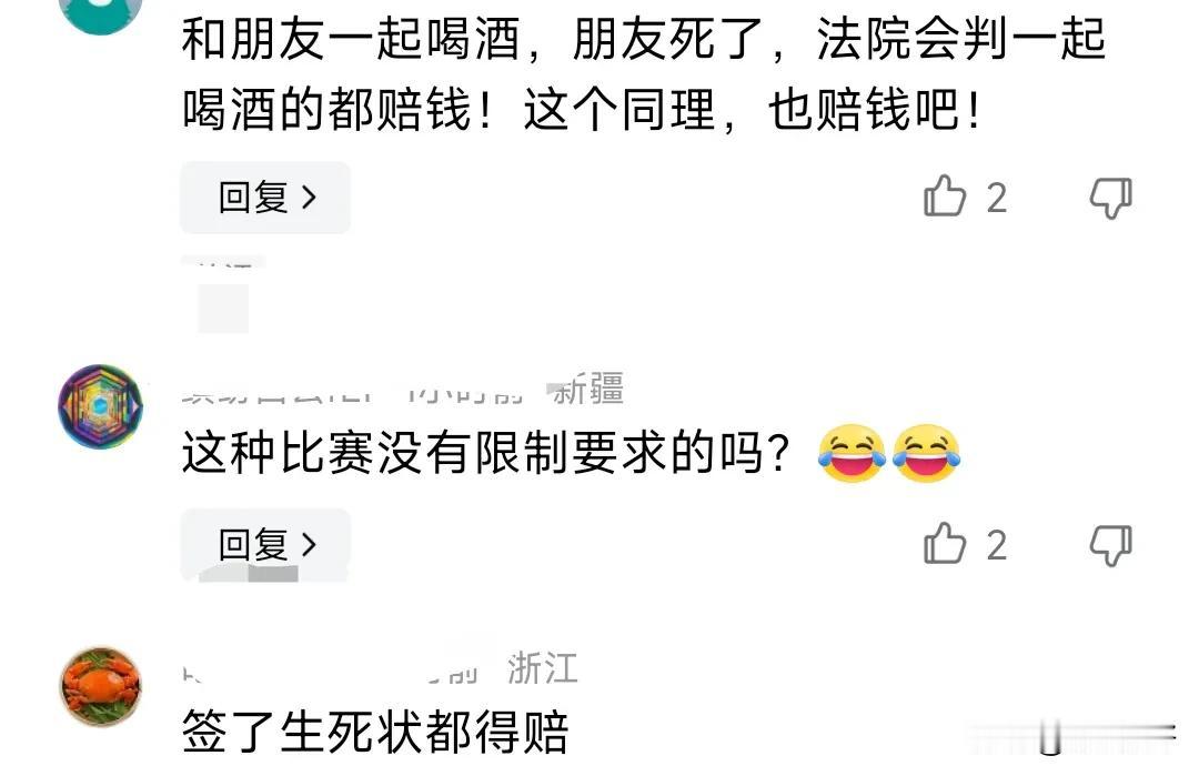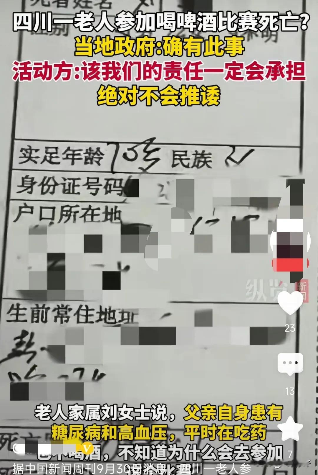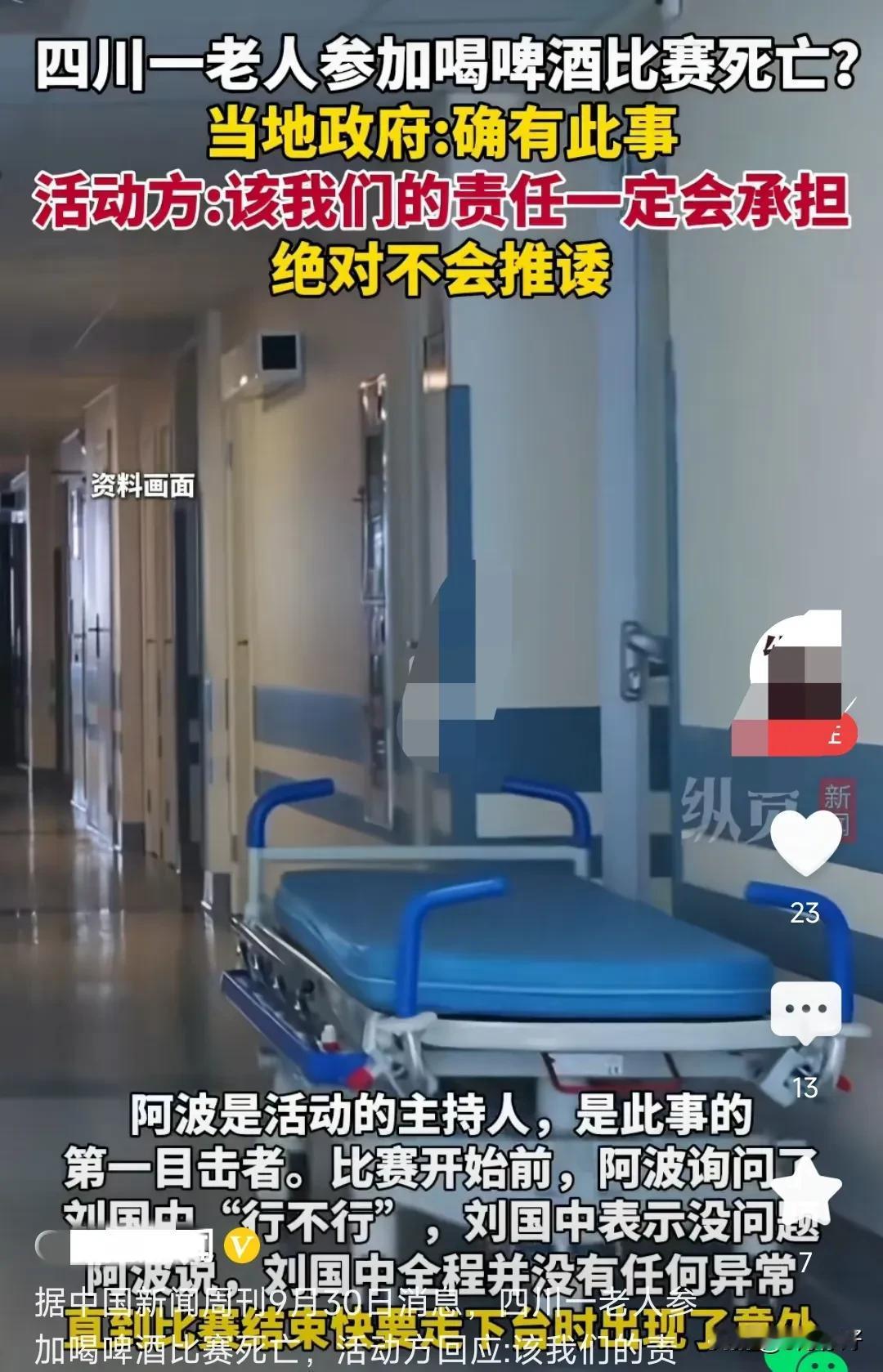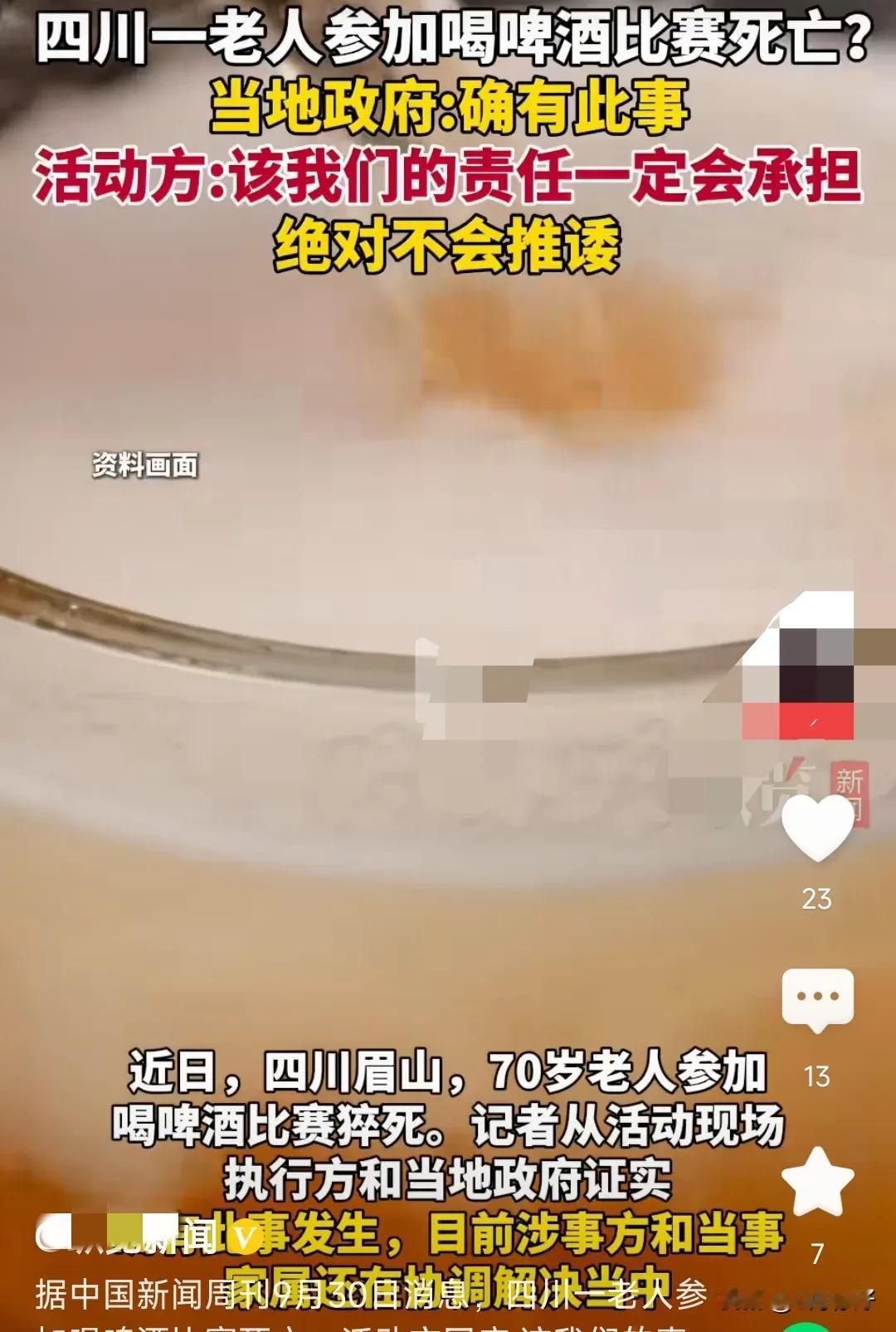 搞啥比赛不好,搞个喝啤酒比赛?近日,四川一老人年过70,竟然参加喝啤酒比赛,真的是太疯狂了,结果导致了猝死。 老人的女儿称,老爷子患有糖尿病和高血压,平时也在吃药,平时不喝酒,不知道为什么会参加这个比赛。 这样的身体条件还去喝酒,真的是匪夷所思。 比赛的主持人说道,喝酒前他问过老人行不行,老人表示没问题,中途也没什么异常,比赛结束快走下台时出现问题。 活动的主办方负责人称,喝酒是自愿参加,也有提示和说明,该负的责任,绝对不会推诿责任。 如果让我来评判的话,个人感觉,老人应该自行承担70%的责任,主办方30%的责任。 #老人参加喝啤酒比赛猝死 多方发声#