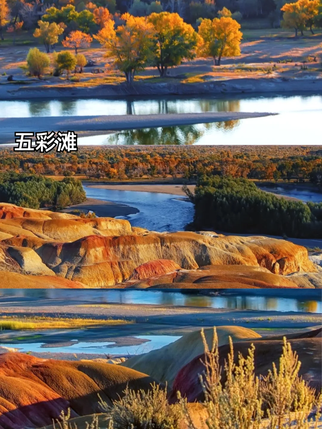 📍五彩滩:秋天色彩更绚丽,岩石多彩,胡杨林金黄,很美。