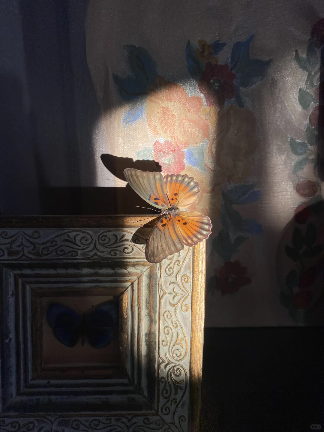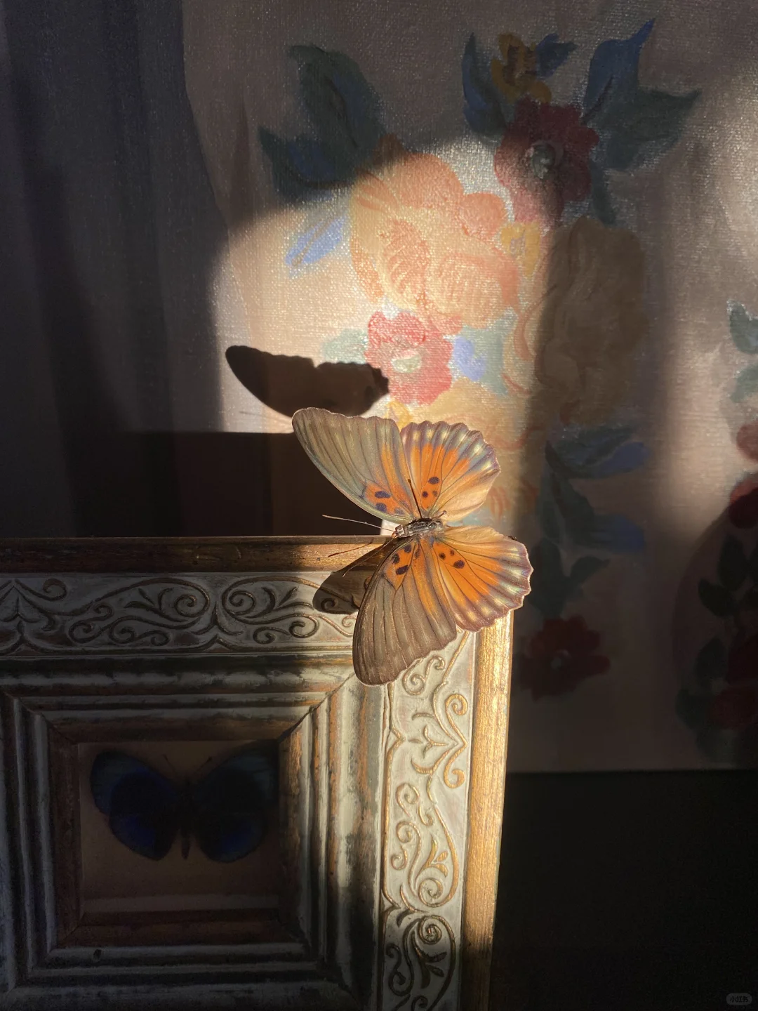 这只蝴蝶的颜色和后面的那幅油画好搭
