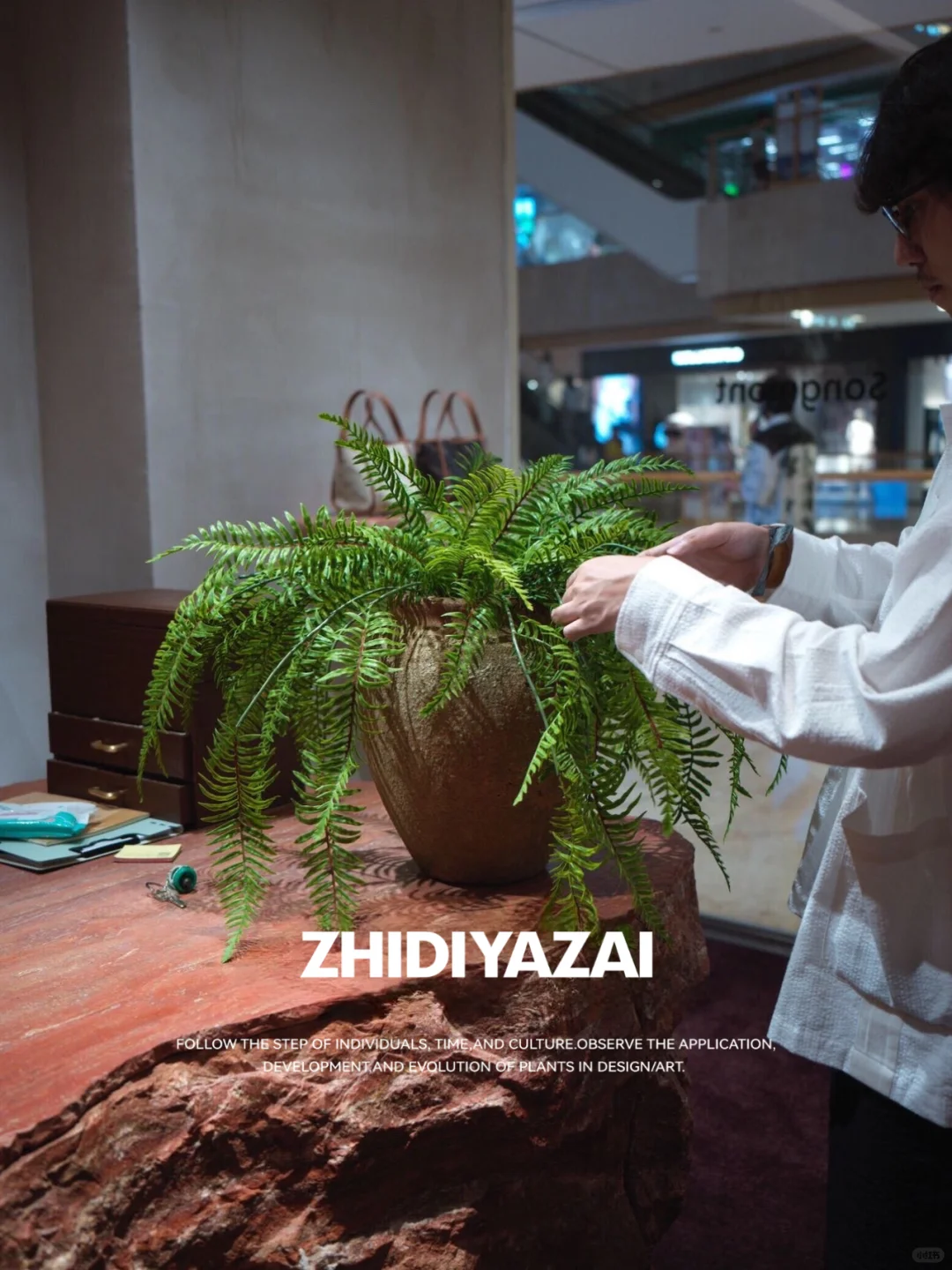 📍山下有松(德基广场店) 选用日本黑松仿真树、配以石块造景呼应品牌名的同时营造诧寂的空间高级感。 角落处挑选枝干较直且茂密的马醉木搭配浅色盆器,与店内硬装风格,色调相呼应。 桌面盆栽选用带有一定垂吊感的彩虹蕨,搭配与落地盆栽相同颜色盆器,让整体风格较为统一,不杂乱。 在商业空间中,仿真植物是不可或缺的,品质好的仿真植物呈现出的效果不亚于真植物,且无需打理,不挑位置,即能保证观赏性,又省心。