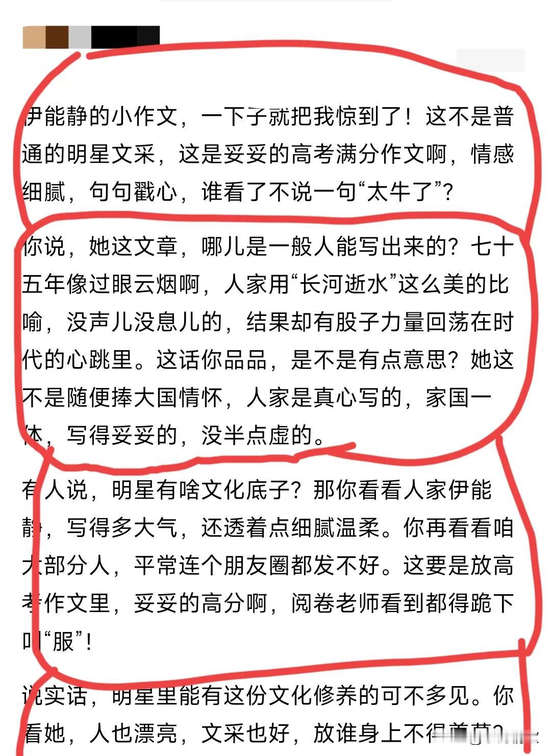 伊能静写了篇文章,被一些网友夸上了天,说文采非常的好,好的让人下跪。 这也太夸张了吧,这马屁拍的也太牛了。 伊能静这篇文章写的还是不错的,比较接地气,通俗易懂,不过也运用了一个非常不错的比喻,也是有一点功底的。 但是这位网友夸的有点太离谱了,感觉有点虚伪了,是个拍马屁的高手。 伊能静这篇文章算是在中等水平吧,只是不知道她用了几成功力在写这篇文章,这篇文章可能不是她的极限。