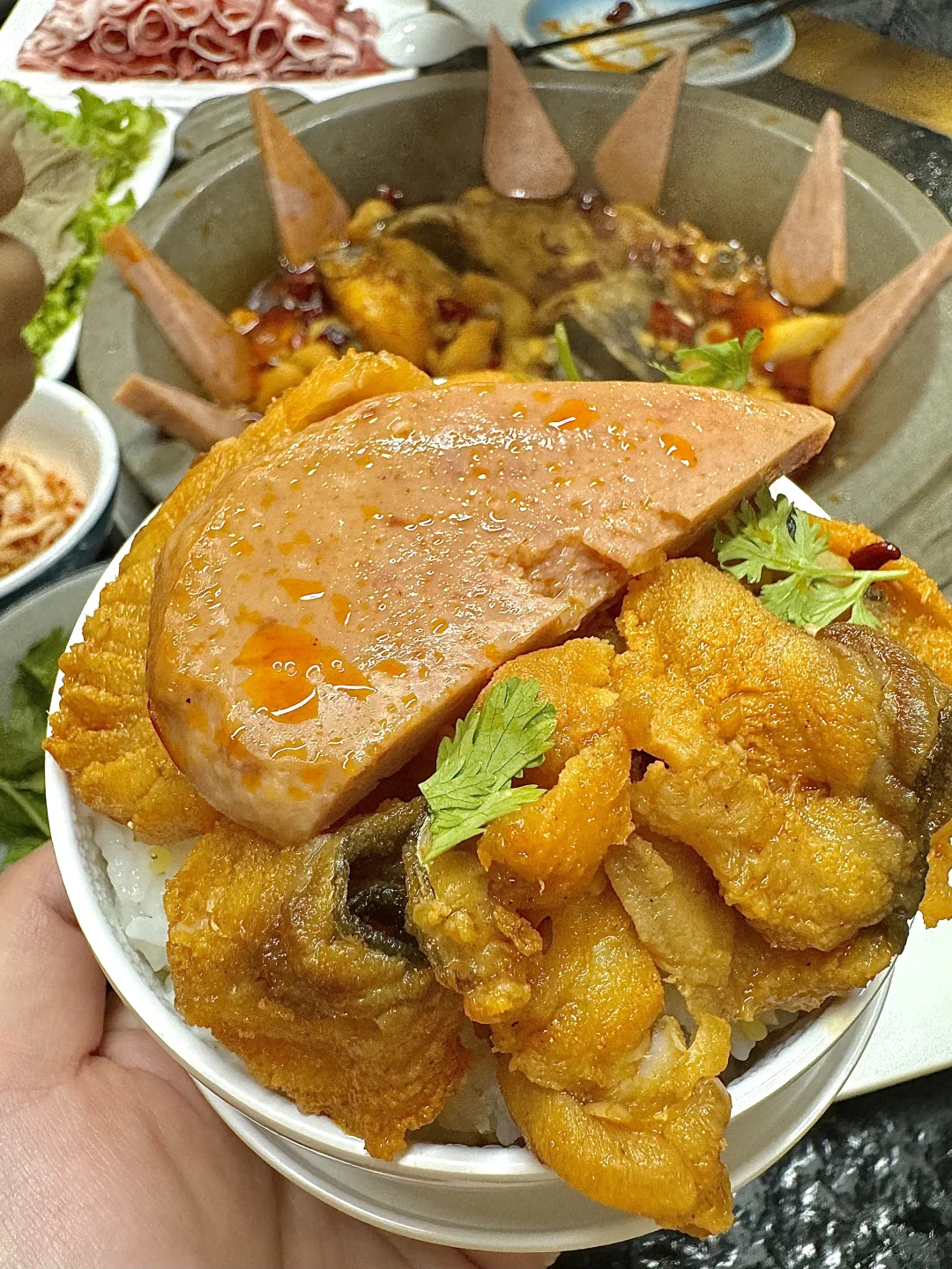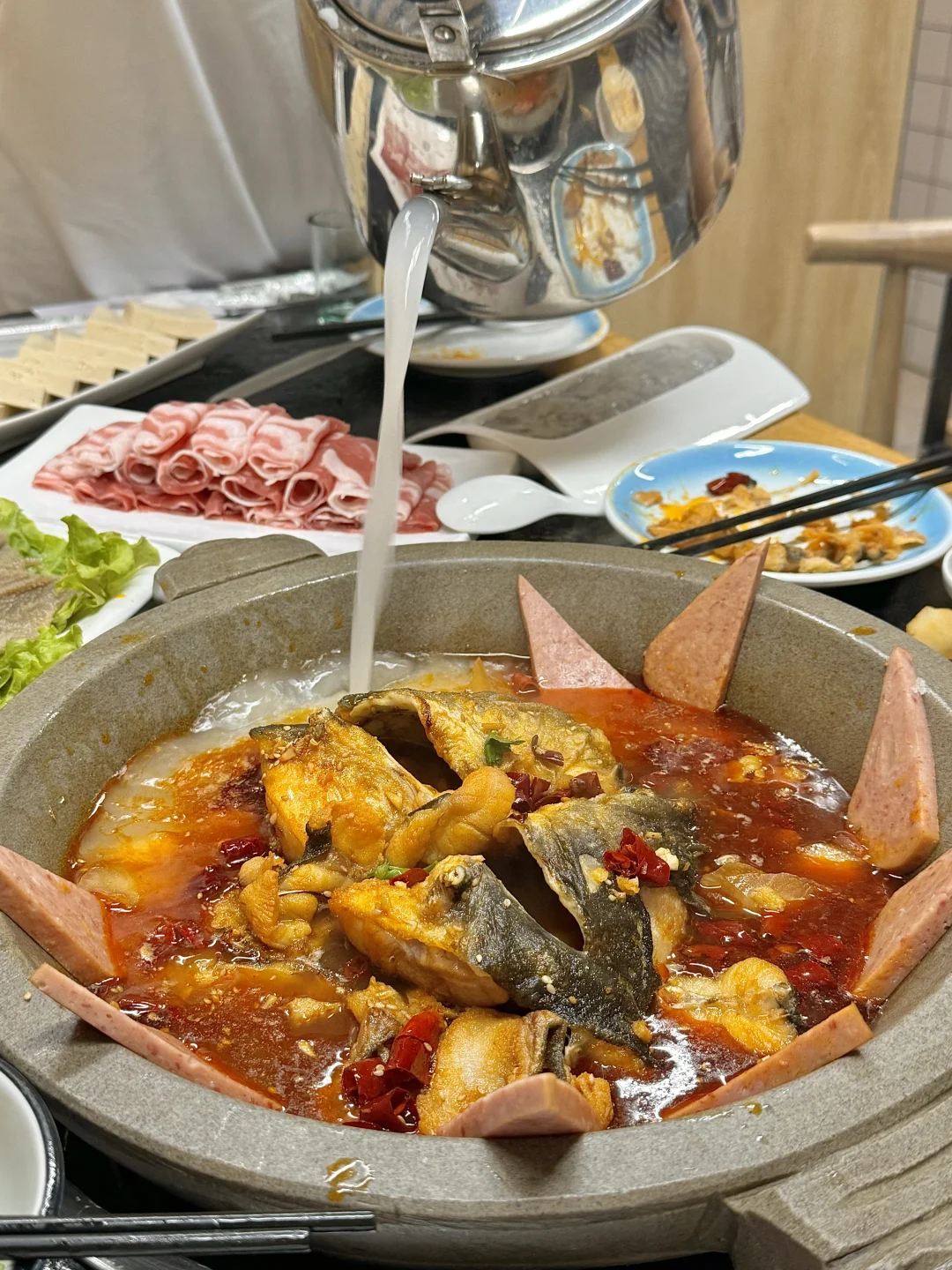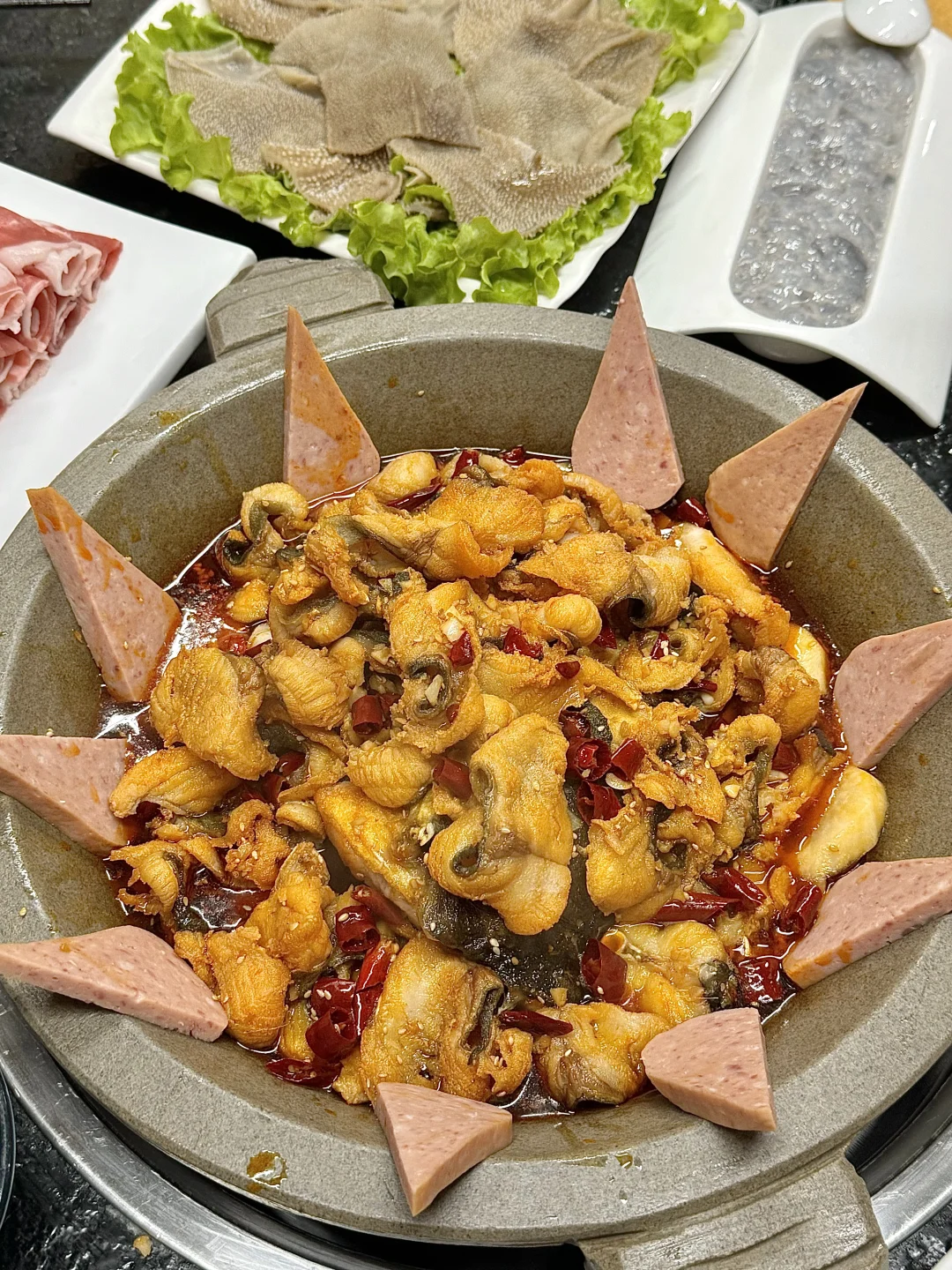 这家石锅鱼开了十多年的店了,和朋友从小时候吃到带着孩子来!对这家店太有感情了… 鱼是乌江鱼,没什么刺。 鱼肉先过油煎再放在石锅里小火咕嘟着~配菜加蟹柳特好吃!甜甜的,贼入味! 虾滑、毛肚、娃娃菜也特别好吃!咕嘟到入味然后再盖在米饭上巨下饭!! 鱼肉盖饭吃也一绝!盖上鱼肉,淋上汤汁超级下饭!好吃s了😭