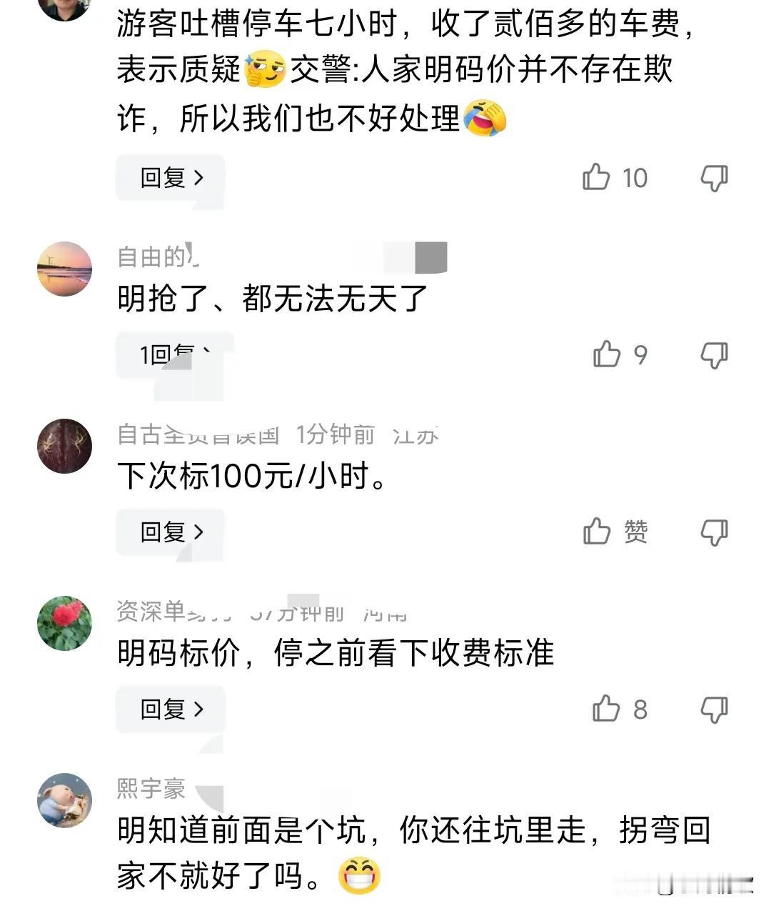 消费的时候肯定要搞清楚价钱,心里要有个数,预期相差太大的话,就容易引发纠纷。10月2日,江苏南京,游客吐槽明孝陵停车场收费太贵,7个小时收了217元。 上面写的是30块每小时,明码标价,这没什么问题。 女子说对面一个停车场停一天才69,走路才5分钟。 贵确实是有点贵,交警说管不了,人家明码标价了,这是景区规定的。 这敲响了警钟,一定要搞清楚价钱再消费。 #游客吐槽景区停车7小时收费217元#