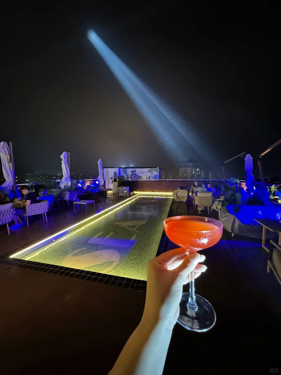 一直只有在娱乐新闻看到的酒店… 开到青岛了!! 好像价格也不贵,性价比还不错! 11楼还有个水烟bar🫧 中间这个泳池真的超出片!! 一下子度假感就来了~ 尤其这两天晚上也凉快点了, 要是有晚霞肯定超出片!! 店里面还有很多老外来玩 他们家鸡尾酒🍹水烟都有 人均也不贵,有种花小钱装大杯的感觉!!