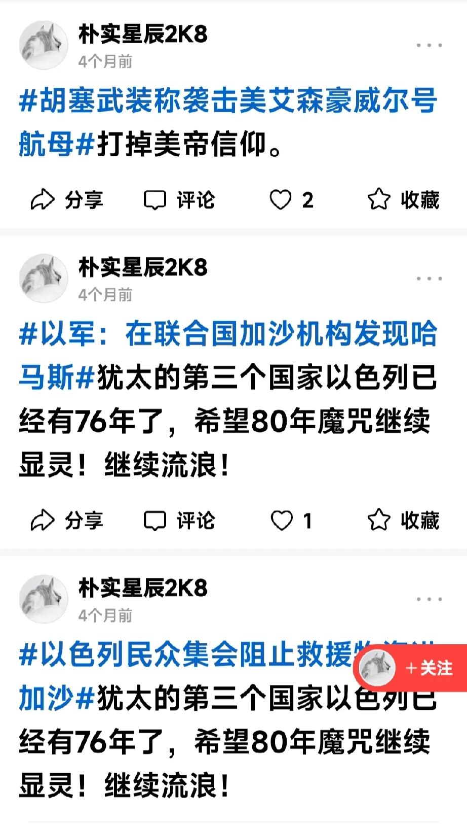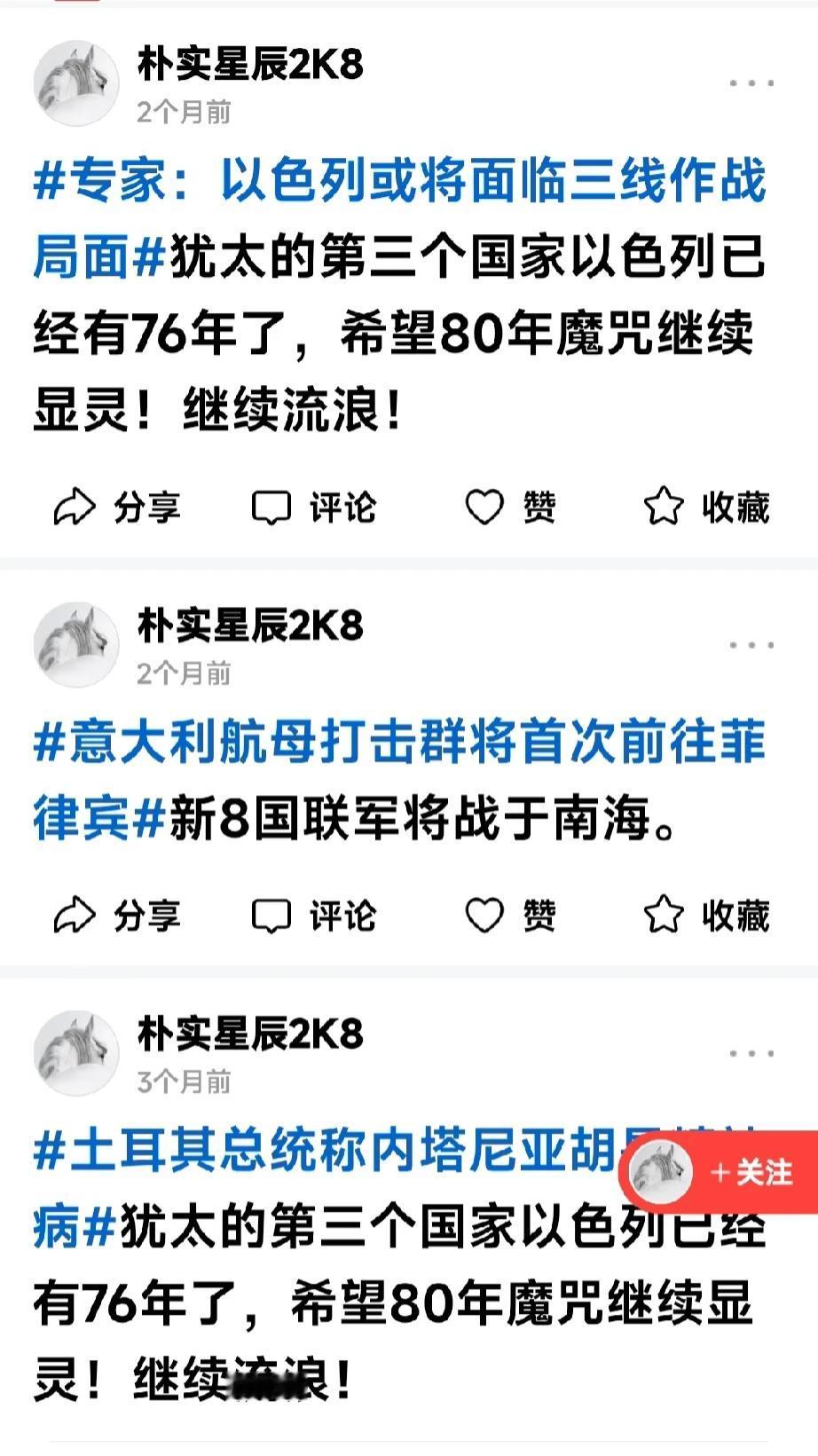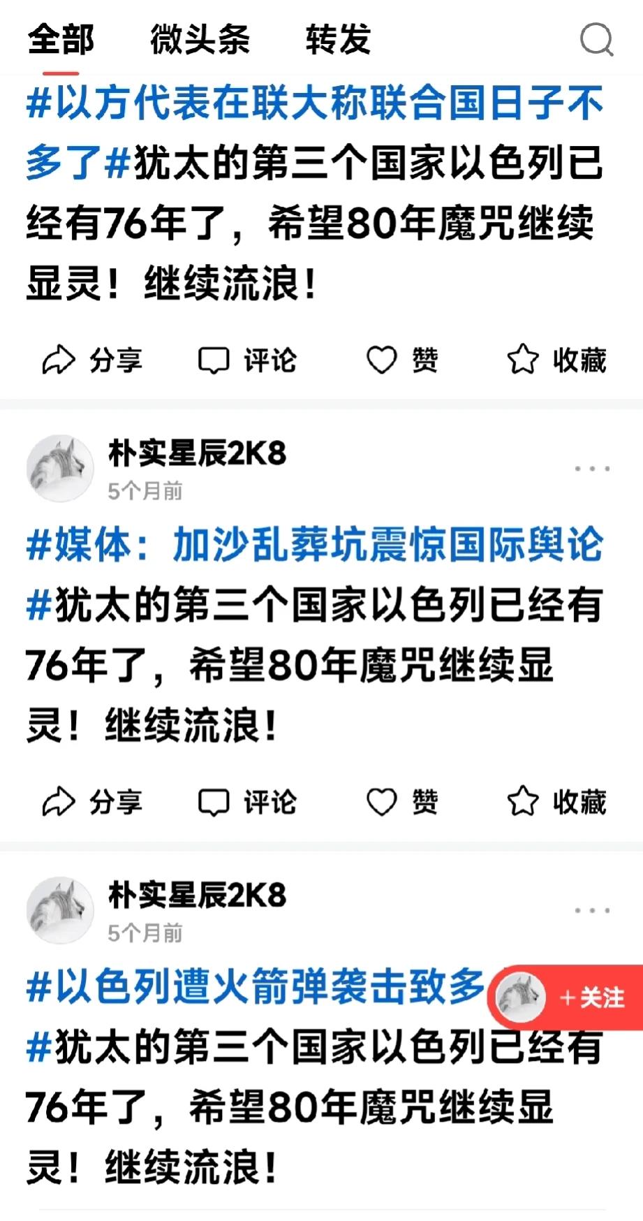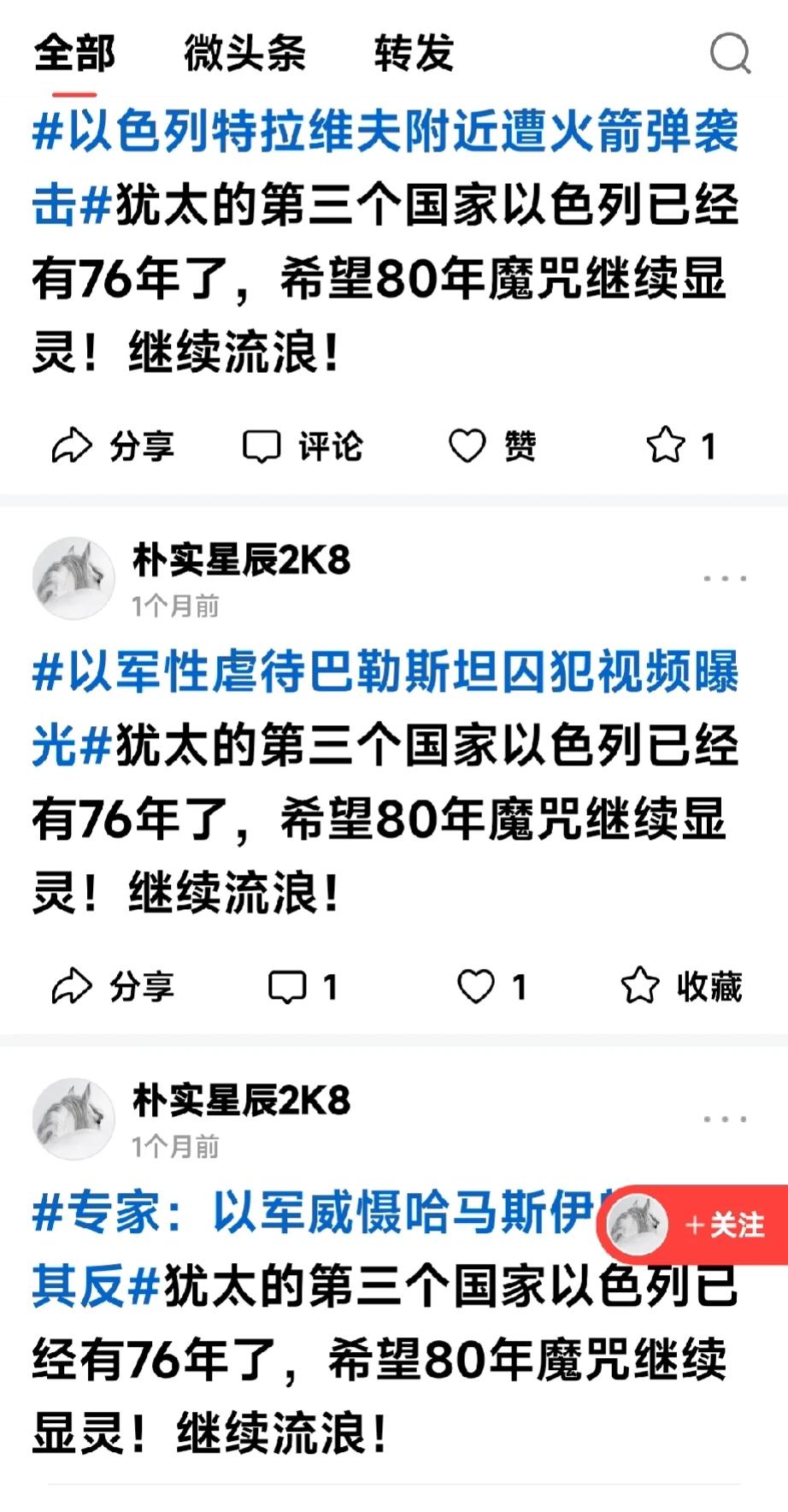 这是有多大仇多大恨???🤣 不管啥新闻,只要关于以色列的,这个黄马斯永远都是一句话,他自己编辑的认为最恶毒的一句话了吧…[捂脸] 这是恨不得生啖下以色列几块肉下来甚至把它扒皮剔骨啊~ ~ ~ 有趣[捂脸],一场诞生于一年前那个日子10.7的突发仇恨——“血海深仇”从天而降,砸中了每一个黄马斯,也许脑壳被砸得太重,从此晕晕乎乎五迷三道浑说起来……[偷笑][偷笑][偷笑] 过上几年或是十年八年的,一旦清醒过来回想今天会不会觉得你要找个地缝钻钻?因为无地自容啊~~~
