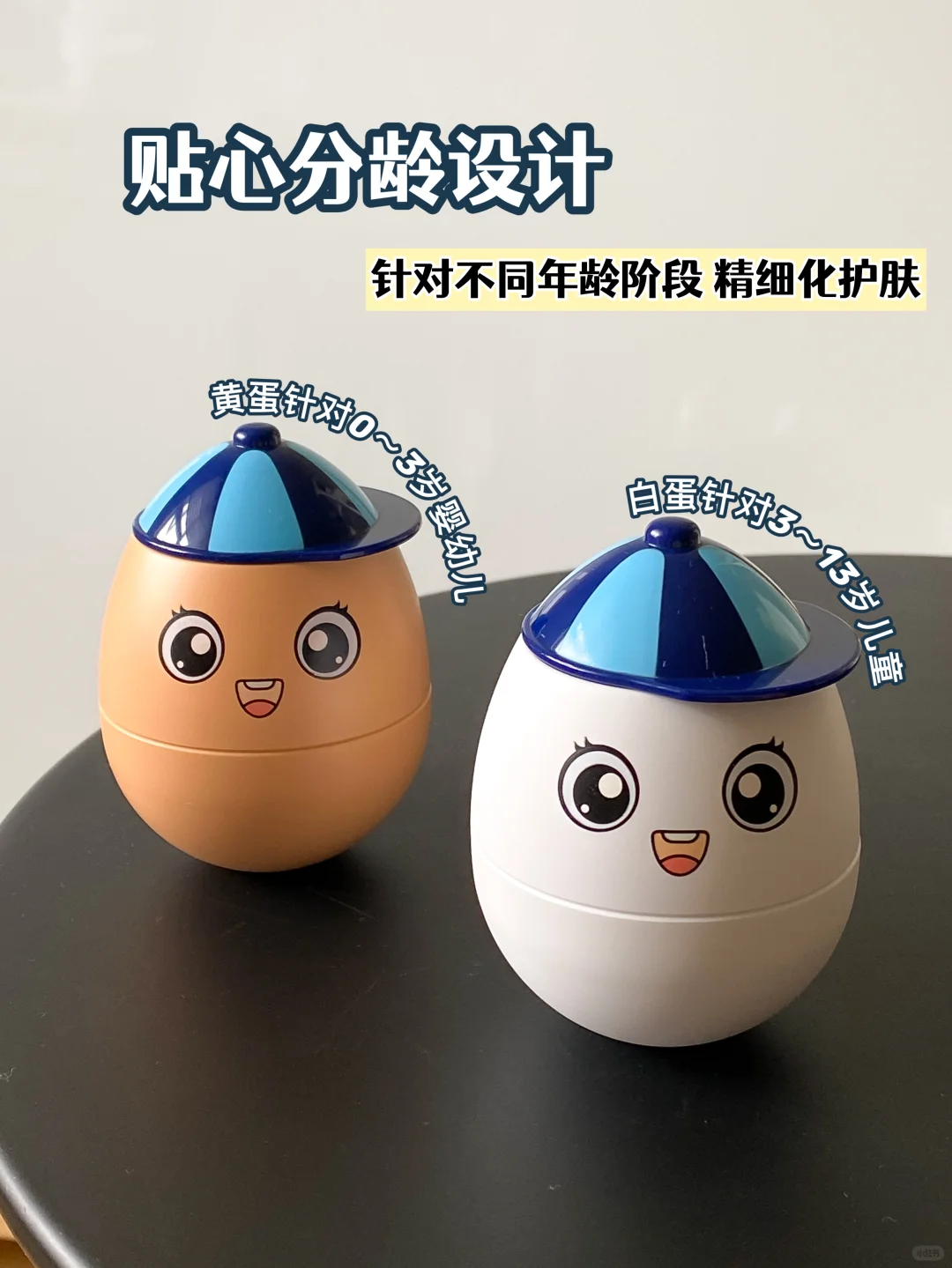 还贴心的做了分龄设计,0~3岁婴幼儿用黄蛋,3~12岁儿童用白蛋,精细化护肤,防润护,一蛋搞定!