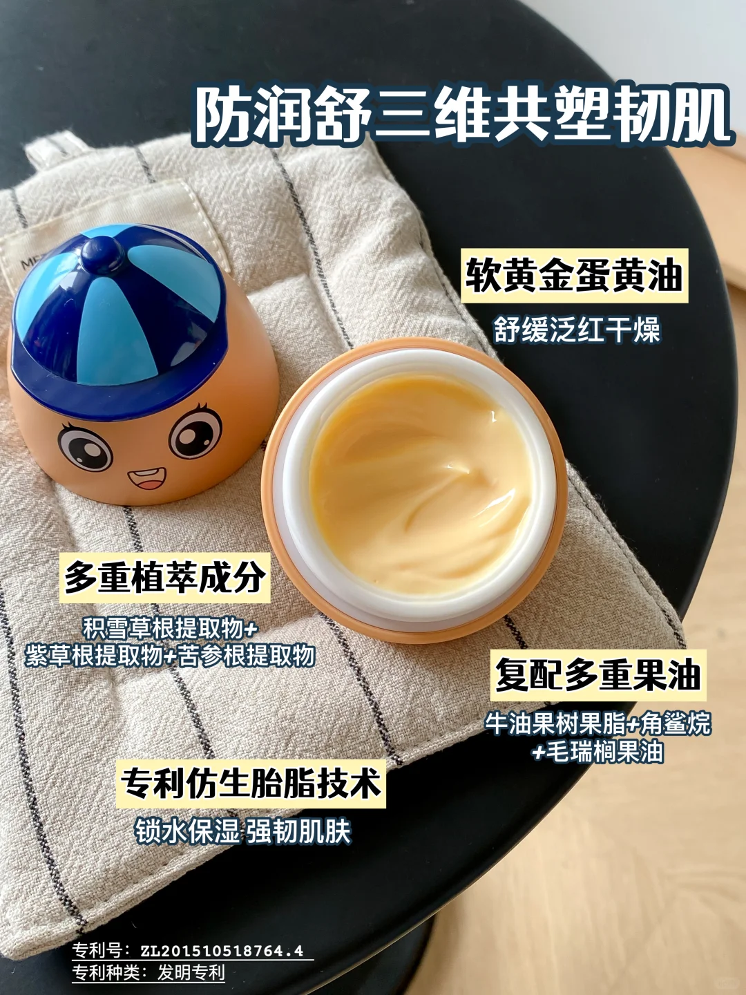 它的成分采用的是“古方多效”蛋黄油,《本草纲目》中均有记录,舒缓泛红干燥,复配多重果油+多重植萃成分,保湿滋润肌肤,还有专利仿生胎脂技术,强韧肌肤屏障(专利号:ZL201510518764.4 专利种类:发明专利)