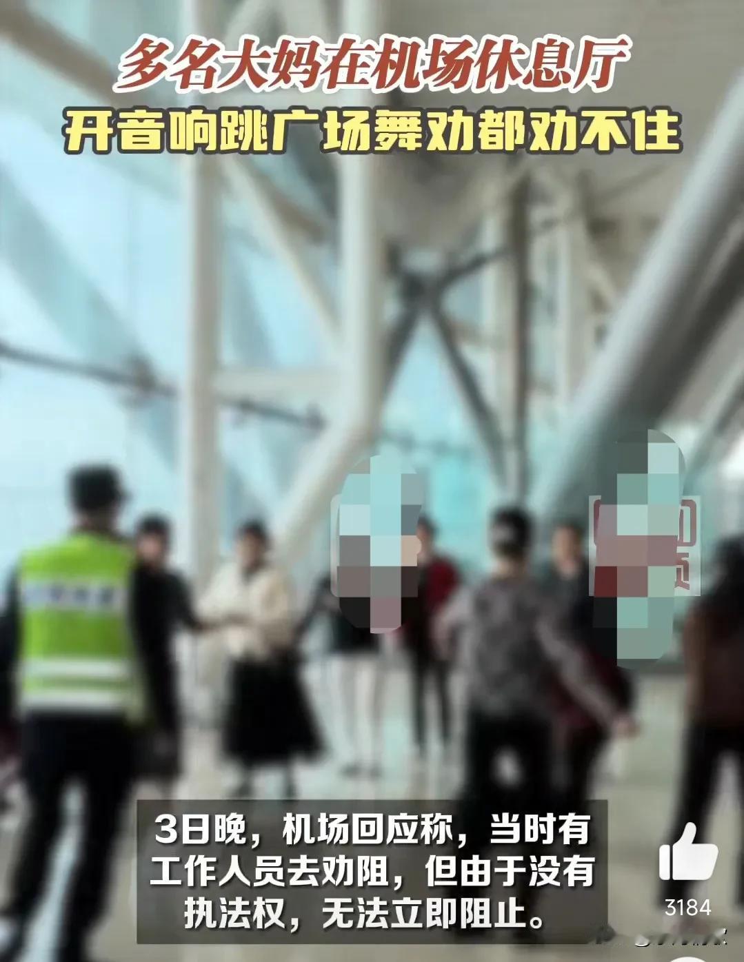 跳广场舞可以跳,但是不要扰民,自觉一点,把声音开小一点,有些大妈就是不知趣,自私自利,缺德到家。 10月3日重庆,多名大妈竟然在休息厅开音响跳舞,这实在是太过分了。休息厅那是能跳广场舞的地方吗? 有人去劝阻,这些大妈还不配合,简直是太无理取闹。 遇到这种屡教不改的,直接报警完事儿,警察给予没收。 看这些缺德的大妈还敢不敢打扰别人,越活越不明白吗?年纪一大把了,老来无德。 #多名大妈在机场休息厅开音响跳舞#