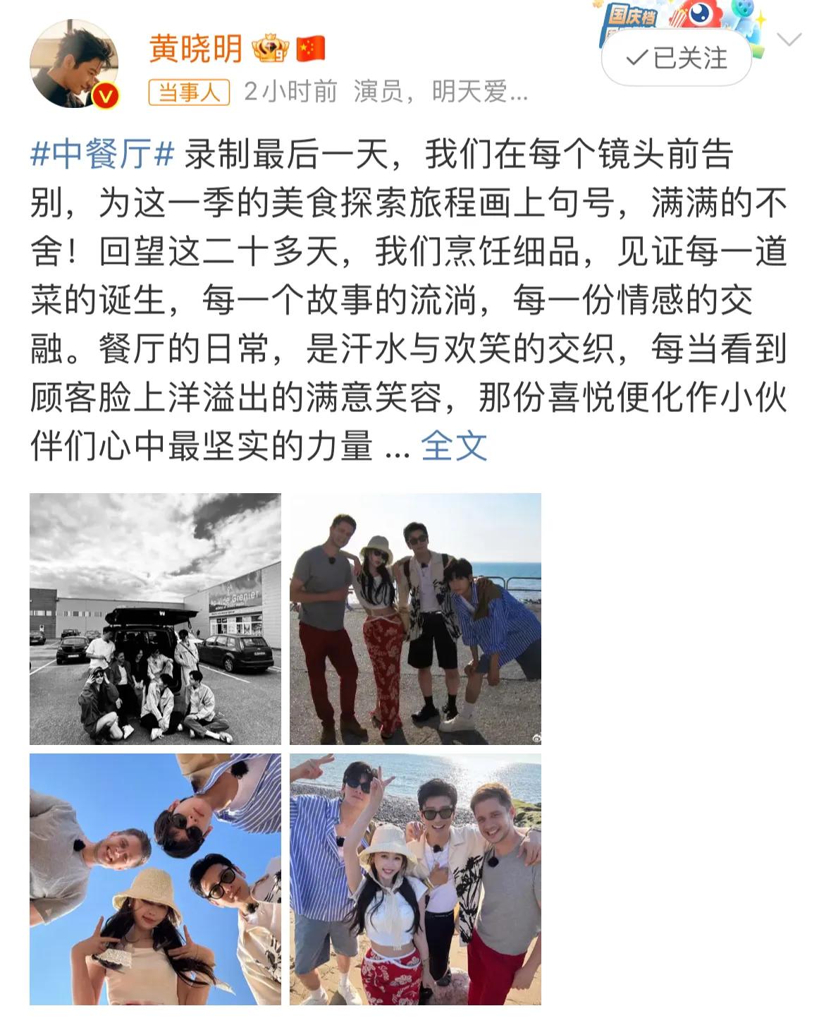 黄晓明发文告别中餐厅8,没想到这个综艺都八季了,晓明哥发的很知情实感了。#黄晓明
