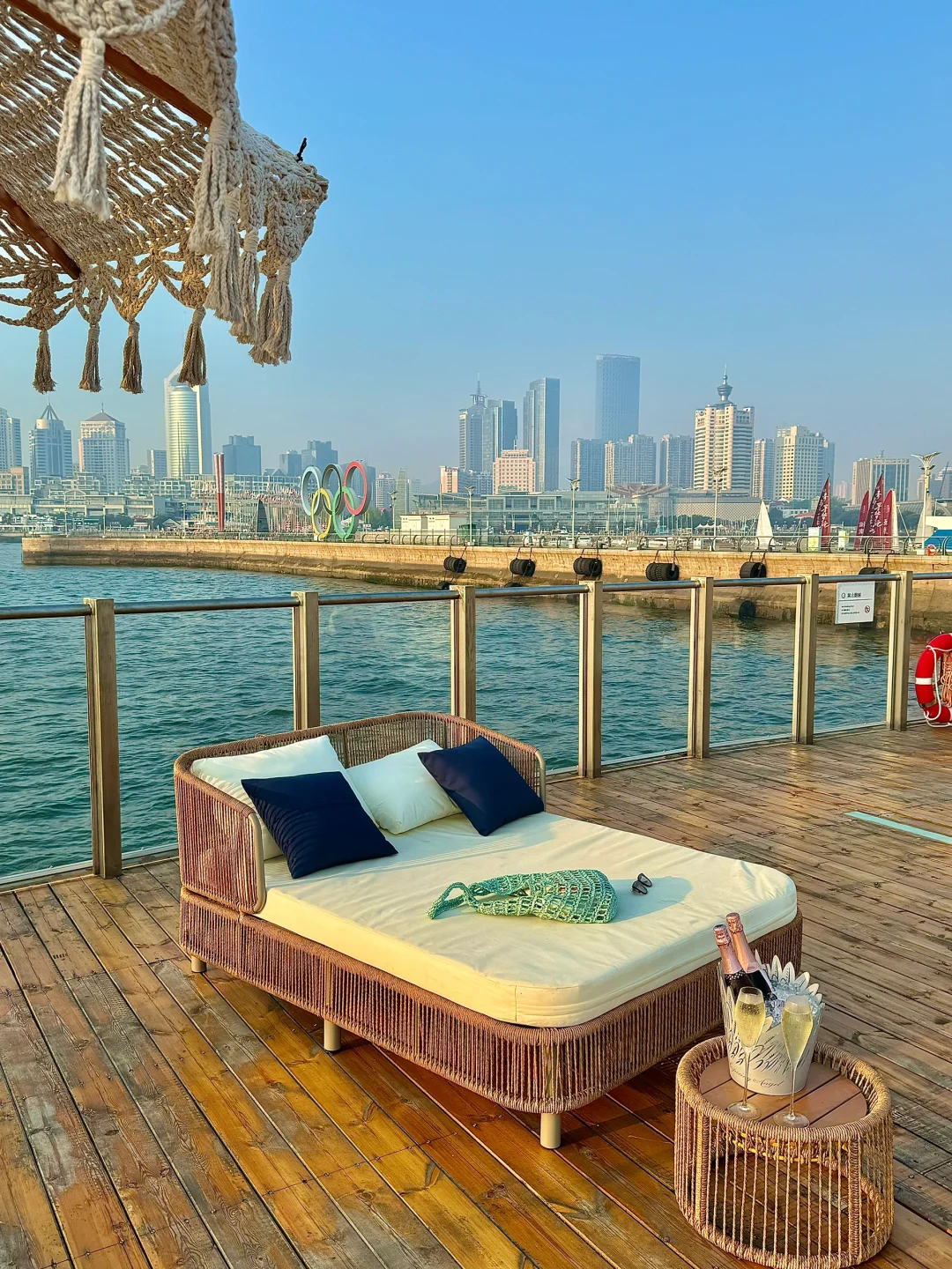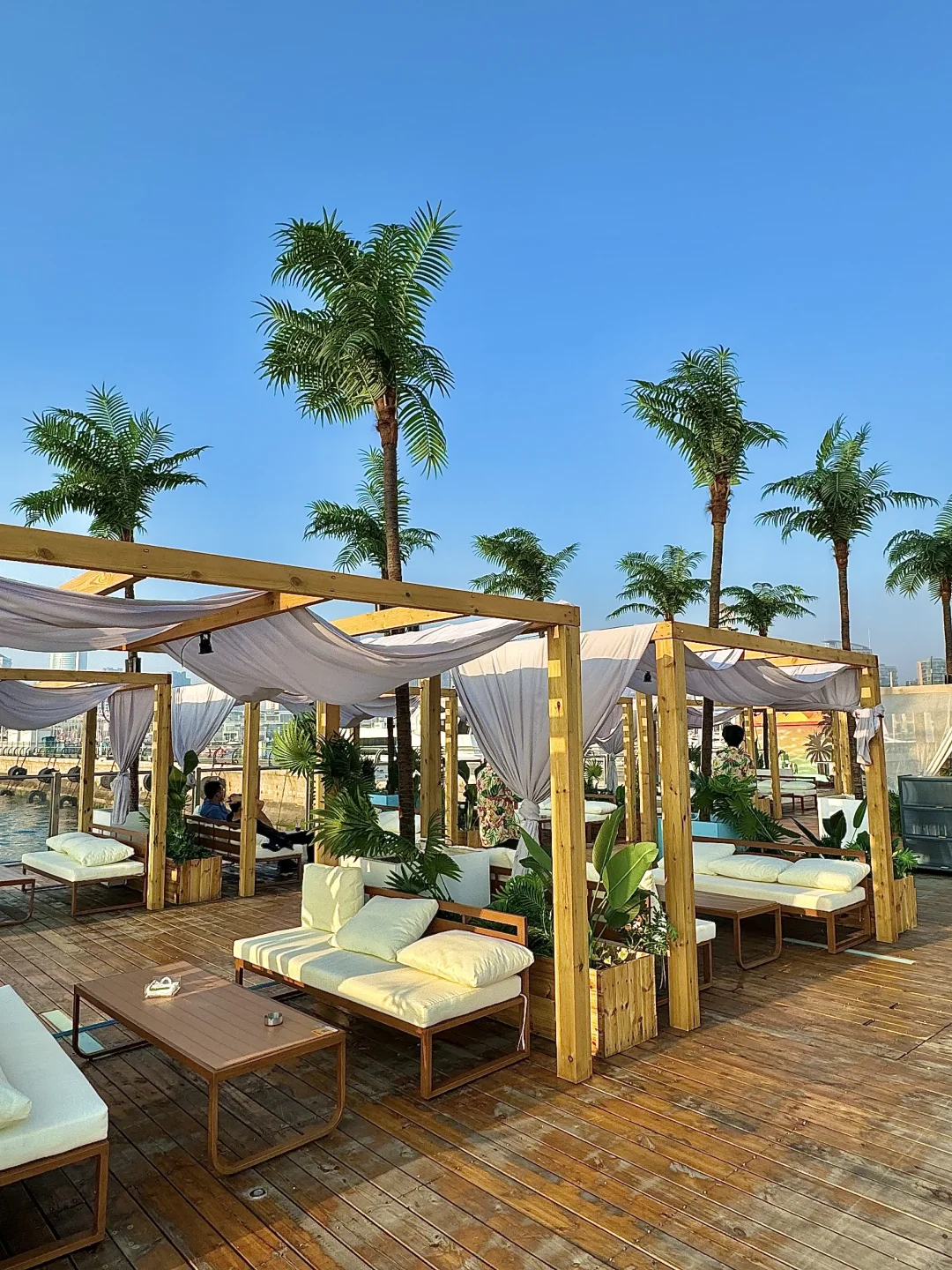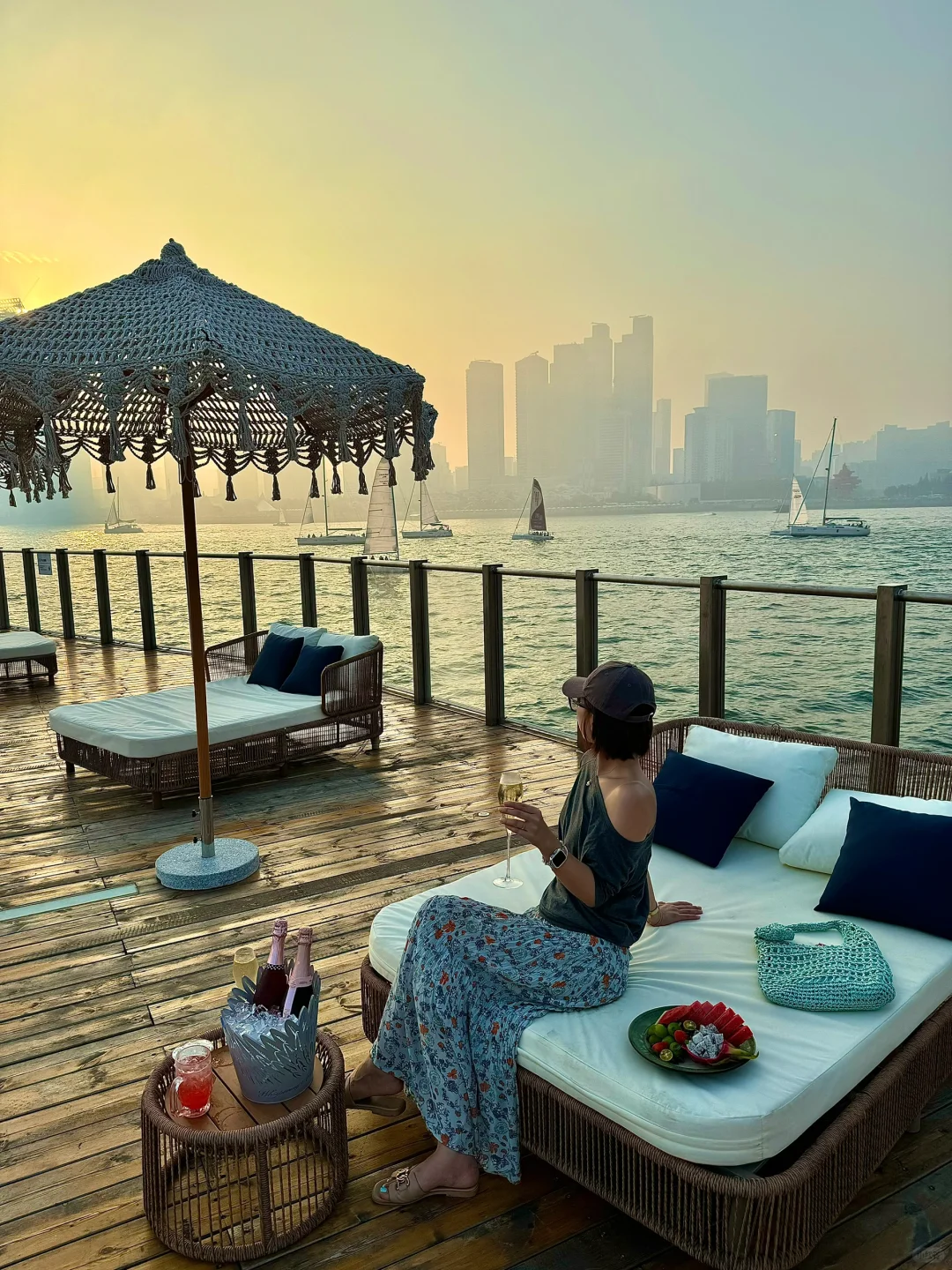 就在奥帆中心里面!! 真的超浪漫💕 可以躺着看日落, 从落日、蓝调再到灯光秀! 我去的这天是金黄色的落日!! 阳光洒在海面金灿灿的✨ 真的太有LA的感觉了~ 主打一个chill 晚上还有di舞台,人均也不高!! 下午茶两人不过百!!