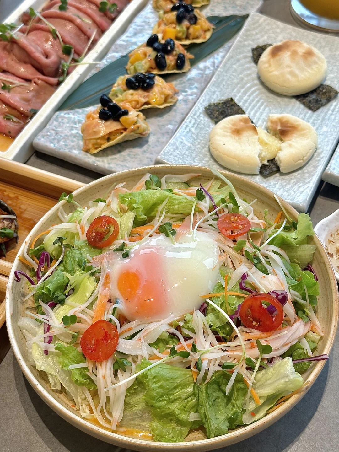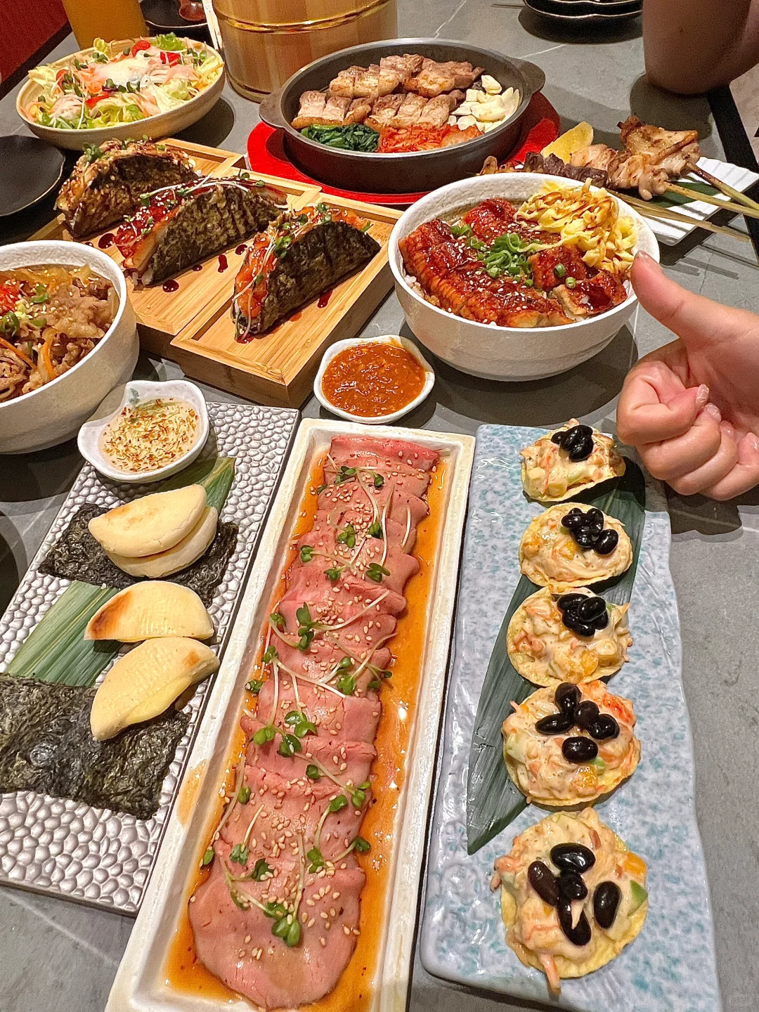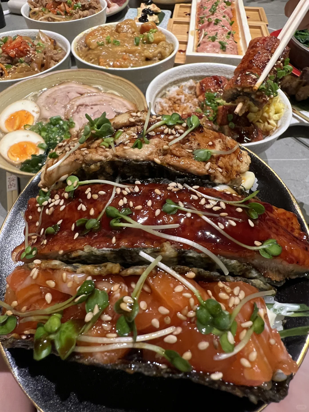 青岛真的遥遥领先!! 吃到3D版海底总动员了🐠🦐🥹!! 太🐮了好吗!! 三文鱼、金枪鱼、甜虾等等~ 希望青岛的日料摆盘都这么卷起来! 太有食欲了!! · 这家就在万象城二期4楼!! 新开的~ 店里氛围特别chill!! 很精致的融合创意融合 tacos🌮鳗鱼饭🍱牛舌🐮 都好好吃!