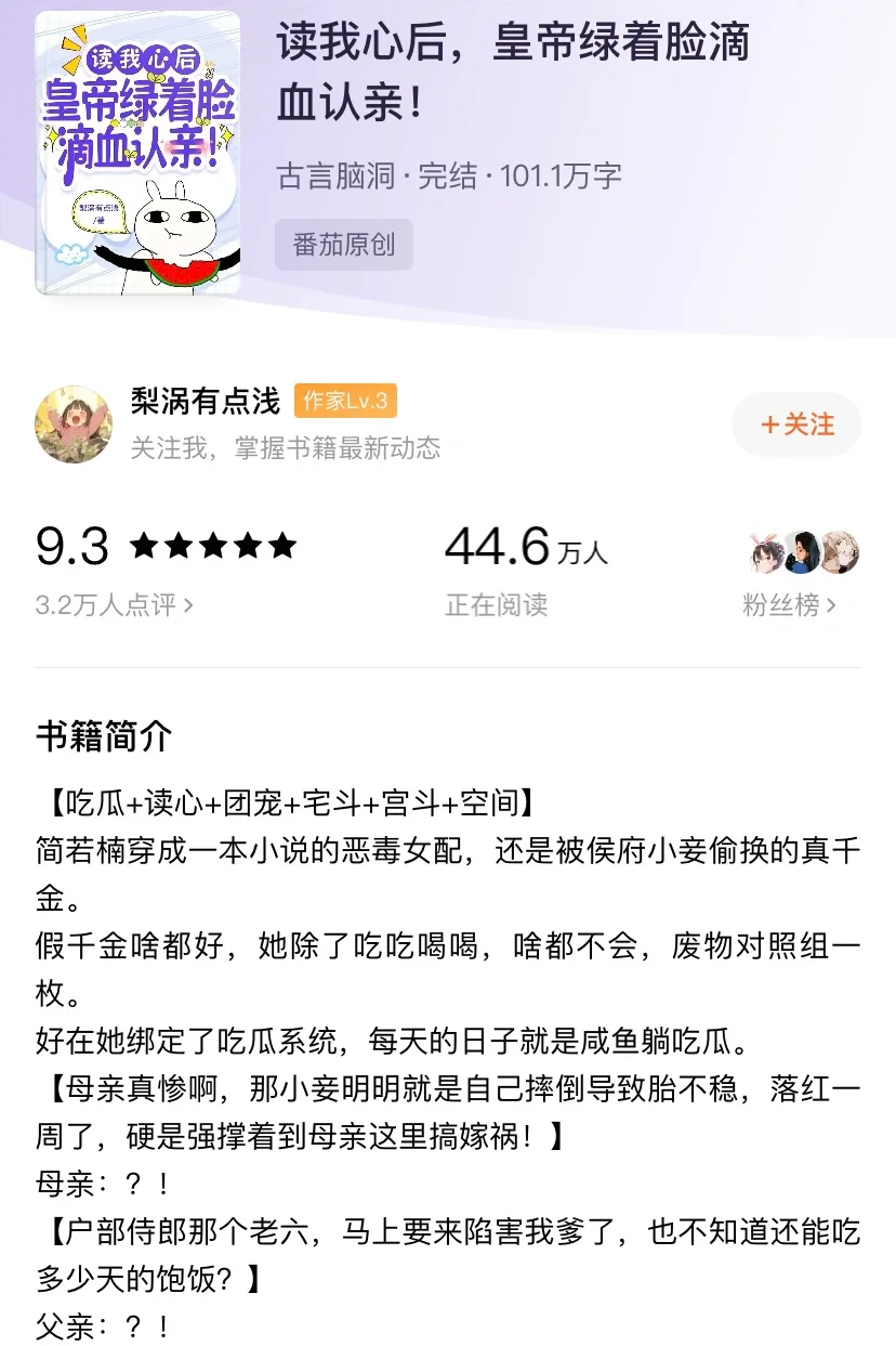 最近有点烦 3 2024-10-05 18:18 这本我弃了。原因是里面的瓜全是有味道的且离谱至极的。比如她继祖母的癖好。而且好像大结局这个祖母都没有下线,正常情况偷人啊,不说沉塘,也要送家庙吧,再不济佛堂用不出来?反正我直接跳到结局看了一下就算了。瓜真的太恶心了