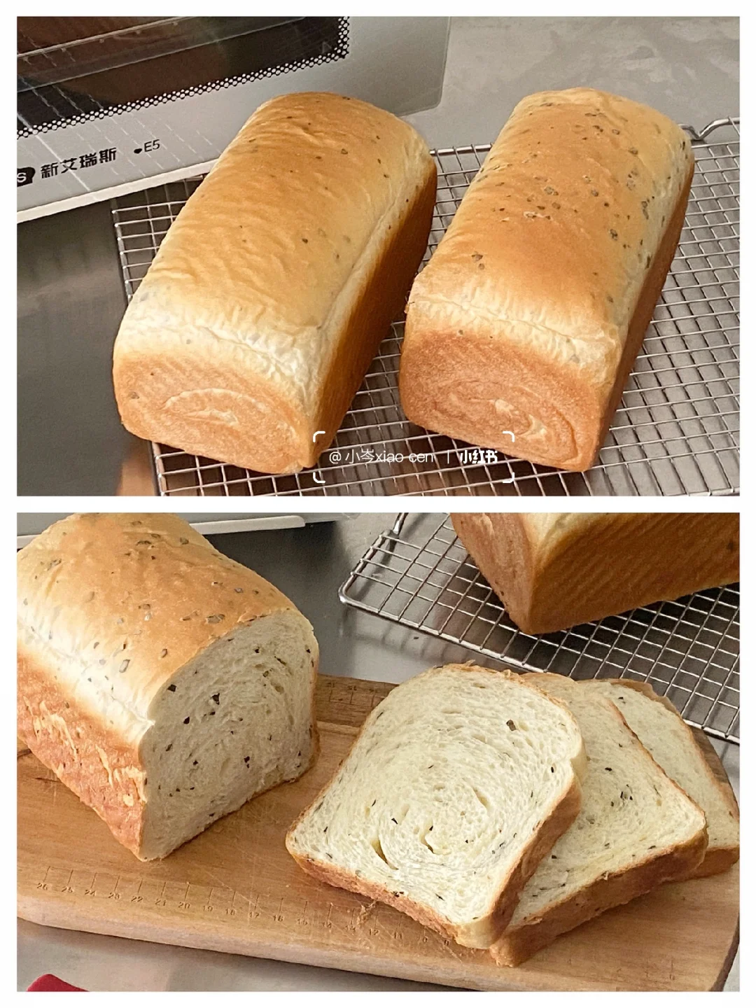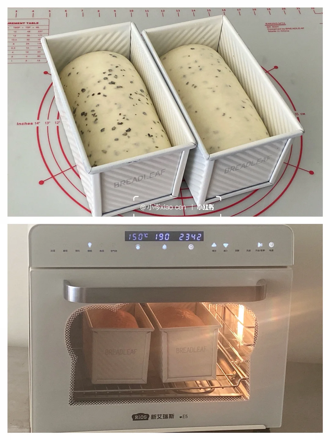 9.放入预热好的新艾瑞斯E5烤箱,下层,低糖吐司盒,上火150度,下火190度,27-28分钟左右,上色满意后