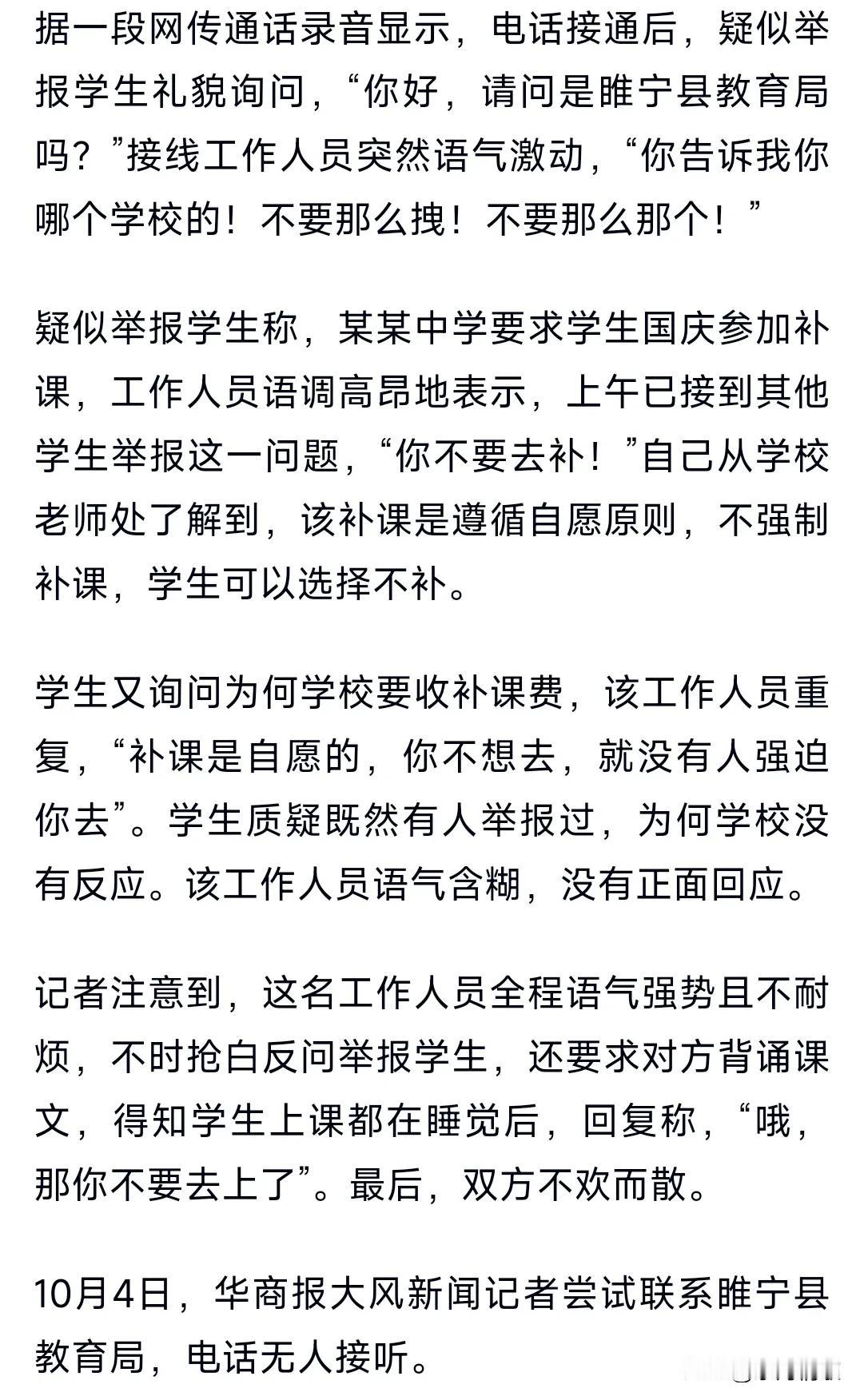 这属实是过分了啊,现在竟然无法无天到国庆节还补课,更离谱的是还要收费。 网传一段录音显示。 一学生向教育局举报称学校违规补课,没想到教育局工作人员脾气很不好,不仅要他背课文,还问他哪个班的。 这工作人员肯定以为举报者不是学生,想试探试探他。 教育局工作人员说是自愿的,不是强制的可以不去。 这工作人员说已经有很多学生举报这个学校违规补课了,学生质问那为什么学校没有反应,依然在违规补课。 学生说既然自愿,那为什么学校要收费呢? 最后双方电话里吵架,双方不欢而散。 确实要好好查查这个学校怎么回事,国庆节是用来休息的,在那里补课并且还收费,实在是太过分了。 这种顶风作案,一定要打击。
