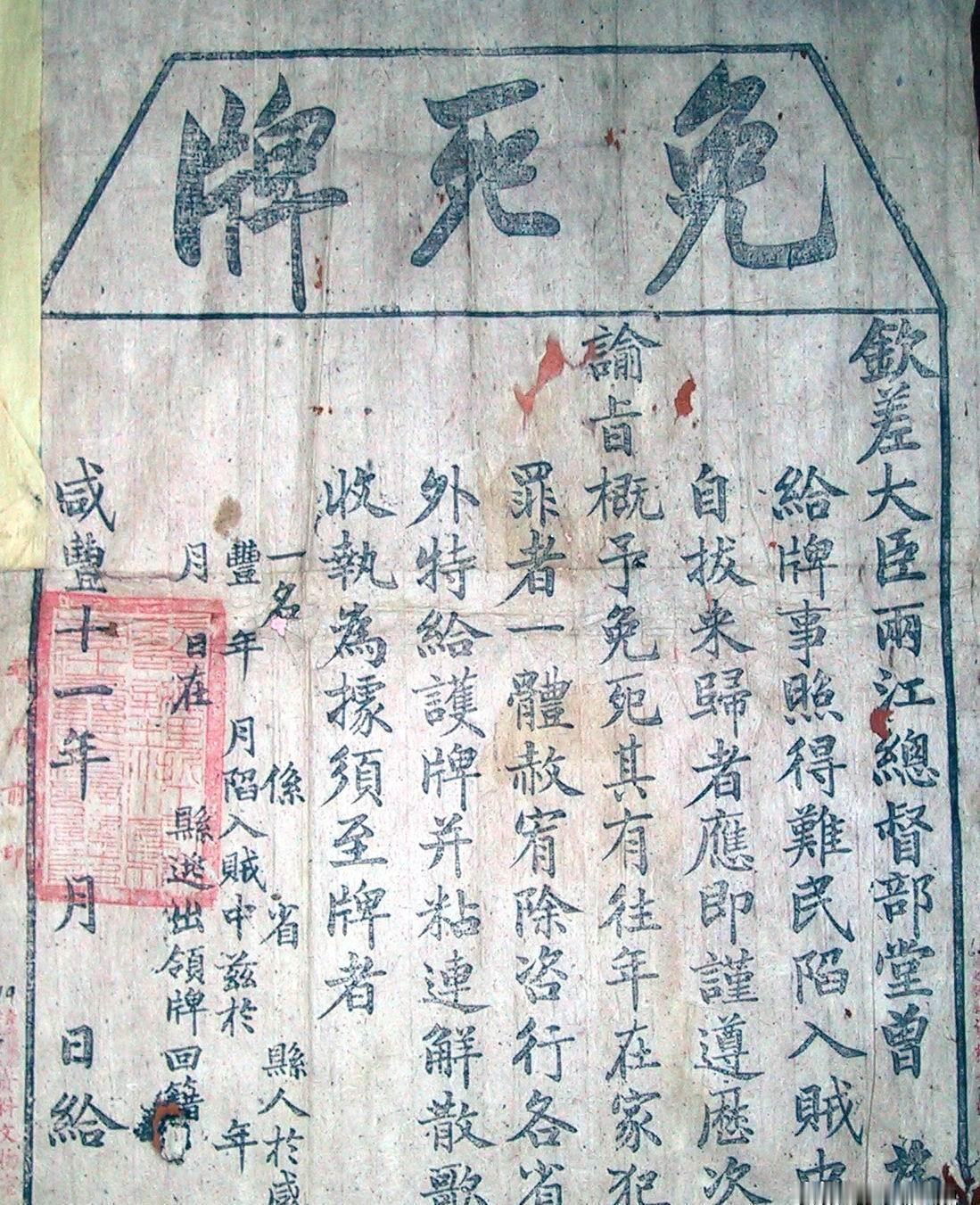 1993年,一农妇正拿旧账本烤火,突然,账本掉出一张盖红章旧纸,旁边会计丈夫捡起一看,顿时大惊失色,这竟是曾国藩颁发的免死牌! 话说在1993年的一个冬天,石家庄郊区的小村庄里,寒风像小刀子似的割人。村里会计老马和他老婆王大姐,俩人就坐家里头,围着暖烘烘的火炉子,一边嗑瓜子一边聊天。王大姐怕火灭了,就从老马那儿拿了几本旧账本,准备烧火取暖。 这些账本啊,都是老马以前用的,记录的都是十几年前的村里的事儿,现在早就没用了。王大姐就一张张撕下来,往火里扔。突然,一张纸从账本里滑了出来,上面还盖着一个红章,看着挺醒目的。王大姐也没多想,就准备顺手给扔火里。 可老马眼尖,一看那红章,心里头就咯噔了一下。他赶紧抢过那张纸,仔细一看,哎呀妈呀,这不是普通的纸,是曾国藩那时候发的免死金牌啊!老马这一看,脸色都变了,心说这可是个大宝贝啊! 俩人就这么大眼瞪小眼地看着这张免死金牌,心里头那个激动啊,简直没法用言语来形容。他们想,这肯定是家里祖辈传下来的宝贝,没想到今天就这么偶然地给翻出来了。从此以后,这张免死金牌就成了他们家的传家宝,逢年过节都得拿出来看看,讲讲这背后的故事。马刚一把拉住妻子,接过了那张纸,定睛一看,上面竟然写着“免死牌”三个大字,让他心里咯噔了一下。再仔细瞅瞅,纸的右下角还写着“两江总督”和“咸丰十一年”,马刚心里琢磨着:“这不会真的是清朝的啥宝贝吧?”他赶紧把这事和妻子说了。 夫妻俩合计了一下,觉得这东西还是交给国家的好。于是,他们去了村长家,想让他帮忙看看。结果村长一看,说是废纸一张,根本不信这是文物。夫妻俩说了半天,村长就是不信,也不愿意帮忙报上去。没辙了,夫妻俩只好决定第二天自己跑到县里的文物站去。 到了文物站,工作人员一看这纸上的字,立刻就重视起来了,还叫来了专家。专家左看右看,最后确认,这真的是曾国藩印的“免死牌”!这牌子薄得跟纸似的,有五十多厘米高,三十多厘米宽,最上面就是“免死牌”三个大字,下面还有黑色的竖条,写着牌子的内容。两江总督曾大人有令,说的是那些不幸落入贼手,自个儿挣脱出来投靠官府的难民们,遵照之前的皇帝旨意,都该得到赦免,重获新生。就算是以前在家乡犯了点小错,这次也一并饶恕了。这不,为了证明这事儿,还特别发了张护牌,还附上一首《解散歌》,拿好这个,就是护身符了。牌子上还会写明人名和日期,家在哪儿,再盖个红彤彤的大印,以示正式。 咱们知道,古时候有种叫“免死牌”的宝贝,那是皇帝赐给大功臣的,铁板上用红漆写着字,分成两半,皇帝和功臣各留一份,既是荣誉也是保障。但这回说的“免死牌”,却是写在纸上的,挺稀罕吧? 这事儿得从1851年说起,洪秀全带着一伙农民兄弟起义了,南京都让他们给占了,建立了太平天国。清政府虽然急得直跳脚,使劲儿打压,可起义军还是越来越壮。这时候,湘军的老大曾国藩想了个招儿,他让人做了好多“免死牌”,还在上面印了首《解散歌》,然后在太平军的地盘上到处发。这意图嘛,就是想让那些动摇了的起义军兄弟看到希望,放下刀枪,回头是岸。《解散歌》这幅书法作品,尺寸颇为讲究,高约成人半臂,宽展近一米,与传说中的“免死金牌”上的字迹一样,都是工整的楷书。它诞生于咸丰十一年的年初,是曾国藩为瓦解太平军而精心策划的一部分。歌里字面上像是在为太平军的艰难处境感到惋惜,但背后的真实意图,却是曾国藩早已暗藏杀机。他广发那“免死”的承诺,不过是个幌子,目的是让太平军放松警惕,一旦找到破绽,就毫不留情地予以打击。