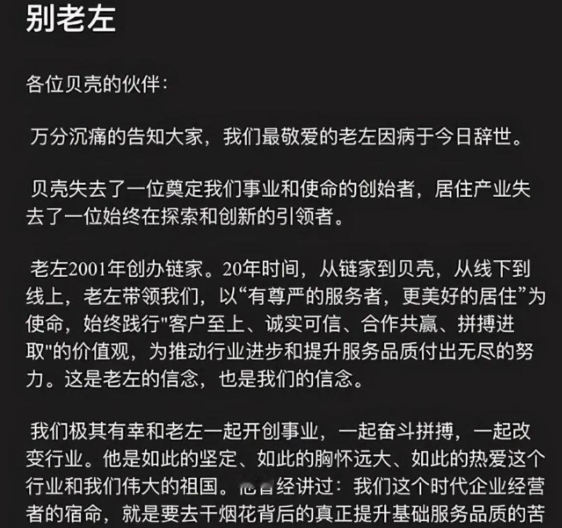 2021年5月左晖传来噩耗,因肺癌离世,年仅50岁。对于一个企业家来说,这个年龄正好是打拼的好阶段,但他却因为肺癌,悄然离世。 左晖,这个名字在2021年的春天,以一种沉重的方式,刻入了我们的记忆。5月的一天,这位年仅50岁的企业家,因肺癌离世,留下了一片唏嘘与不舍。在谈到他的离世时,我们不禁会想起那句:“生命的价值,并不仅仅在于你拥有多少财富,而在于你如何使用它。”这句话,仿佛就是为左晖量身定制的,精准地概括了他的一生。 左晖的离世,让人唏嘘不已。他的人生,就像是一场精彩的戏剧,才刚刚进入高潮,就戛然而止。50岁,对于很多人来说,是事业的巅峰期,是享受人生果实的黄金时代。然而,命运却对他开了一个残酷的玩笑,让他在人生的巅峰时刻,被病魔夺去了生命。这样的结局,让人难以接受,更让人感叹生命的脆弱与无常。 然而,我们更应该记住的,是左晖在生前所留下的那些宝贵的精神财富。他的一生,是对“如何使用财富”这个问题最生动的诠释。他不仅仅是一个成功的企业家,更是一个有着深邃思想、崇高追求的人。他用自己的行动,证明了生命的价值并不在于你拥有多少财富,而在于你如何使用它去创造价值、去影响他人、去推动社会的进步。 左晖的创业之路,充满了坎坷与挑战。但他始终保持着对事业的热爱与执着,不断追求卓越、勇于创新。他用自己的智慧和汗水,打造了一个又一个优秀的企业,为社会创造了巨大的价值。他的成功,不仅仅是个人的荣耀,更是整个行业的骄傲。他的离世,无疑是对整个行业乃至社会的巨大损失。 然而,左晖的影响力并没有因为他的离世而消失。他的精神、他的理念、他的追求,将继续激励着后来者前行。他的故事,将成为一段传奇,被后人传颂。我们相信,在未来的日子里,会有更多的人受到左晖的启发和鼓舞,用自己的方式去诠释生命的价值、去创造属于自己的辉煌。 左晖的离世,也让我们更加深刻地认识到生命的宝贵与脆弱。我们应该珍惜每一分每一秒的时间,用心去生活、去工作、去爱我们所爱的人。我们应该努力追求自己的梦想和目标,不断提升自己的能力和素质,为社会的进步和发展贡献自己的力量。同时,我们也应该关注自己的身体健康和心理健康,保持积极向上的心态和乐观的生活态度。因为只有这样,我们才能真正地活出自己的价值、实现自己的人生目标。 左晖的离世,是一个沉痛的教训也是一个深刻的启示。它告诉我们:生命是短暂的、珍贵的、不可复制的。我们应该珍惜它、尊重它、善待它。同时,我们也应该用自己的方式去诠释生命的价值、去创造属于自己的精彩人生。因为只有这样,我们才能在有限的生命里留下无限的精彩和回忆。在房地产的浩瀚星空中,左晖这个名字犹如一颗璀璨的星辰,照亮了无数追梦人的心路历程。从一个默默无闻的小中介所出发,他一步步攀登,最终站上了全国房产交易之巅,其背后的故事,不仅仅是关于财富的累积,更是对梦想与坚持的颂歌。然而,正当他的事业如火箭般蹿升之际,命运却突然转折,病魔的侵袭让这位商业巨擘的生命戛然而止,留下了无尽的遗憾与深思。外界种种猜测与议论纷至沓来,尤其是关于“黑心钱”与报应的论调,更是让这段传奇蒙上了一层神秘的色彩。但深入剖析,我们会发现,真相远比这些流言蜚语要复杂且深刻得多。 时间回溯到2003年,那是一个互联网与房地产尚未完全融合的年代,左晖却以超前的眼光和胆识,创立了第一个中介所交易中心。在这个平台上,他摒弃了传统中介行业的种种陋习,如信息不透明、服务不规范等,转而以诚信和透明为基石,构建起了一套全新的交易体系。他深知,只有让交易过程变得清晰可见,才能赢得客户的信任与尊重。于是,他亲力亲为,制定了一系列详尽的规则和流程,确保每一个环节都能经得起时间的考验。