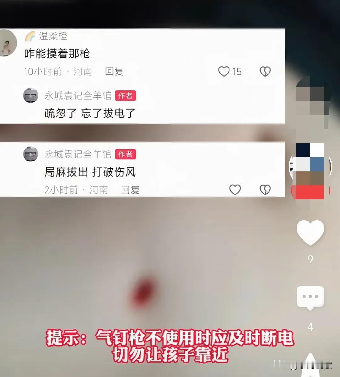 这真的是太防不胜防了。近日,河南,一女孩将5厘米的气枪钉打进了肚子,只听一声枪响,众人朝响声的方向望过去,随之传来女孩痛苦的哭声。 大人纷纷跑过去查看女孩的情况,送到医院,幸亏取了出来,没什么大碍,还好没有打到肠子。 当时没有断电,造成这一隐患,大人也应该看管好自己的小孩。 这样的悲剧也不是一起了,确实要小心气钉枪这种危险的工具。#女孩将五厘米气枪钉打进肚子#