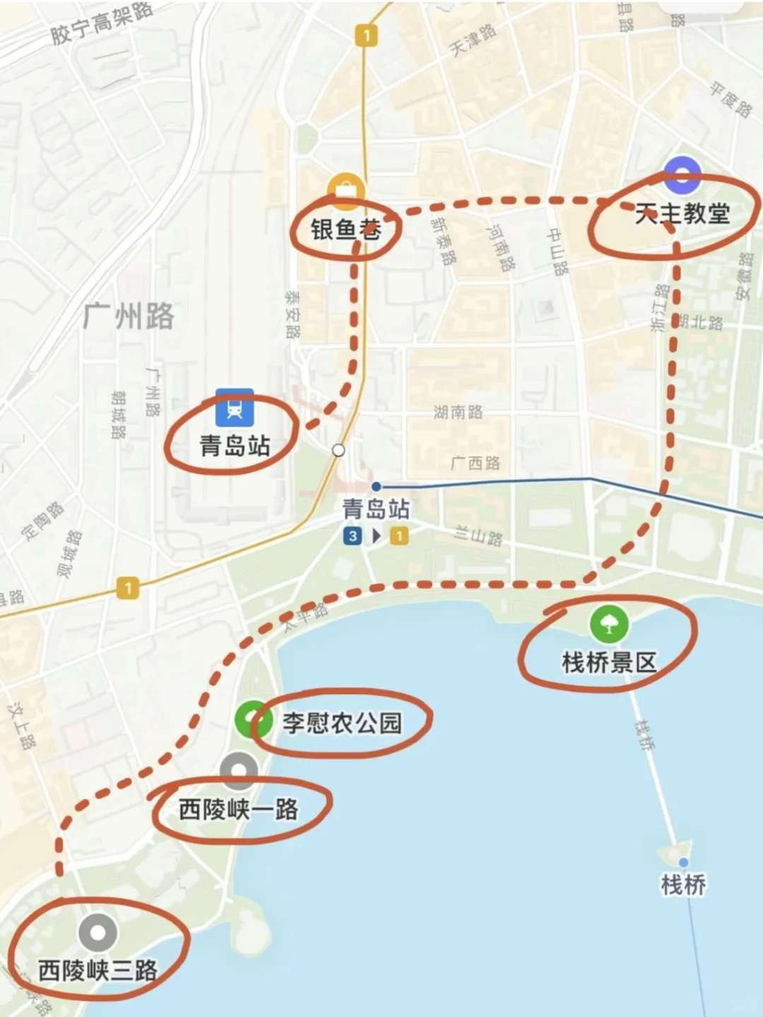 青岛的天气尊嘟好好!! 分享大家栈桥小众看海路线 人少景美🌊 可以看到图5栈桥人真的好多 这个海岸线就在旁边 ✨青岛站——西陵峡路——李慰农公园(栈桥小众合影机位)——栈桥——天主教堂——大鲍岛 人不算多 沿着海岸线走走好出片~ -