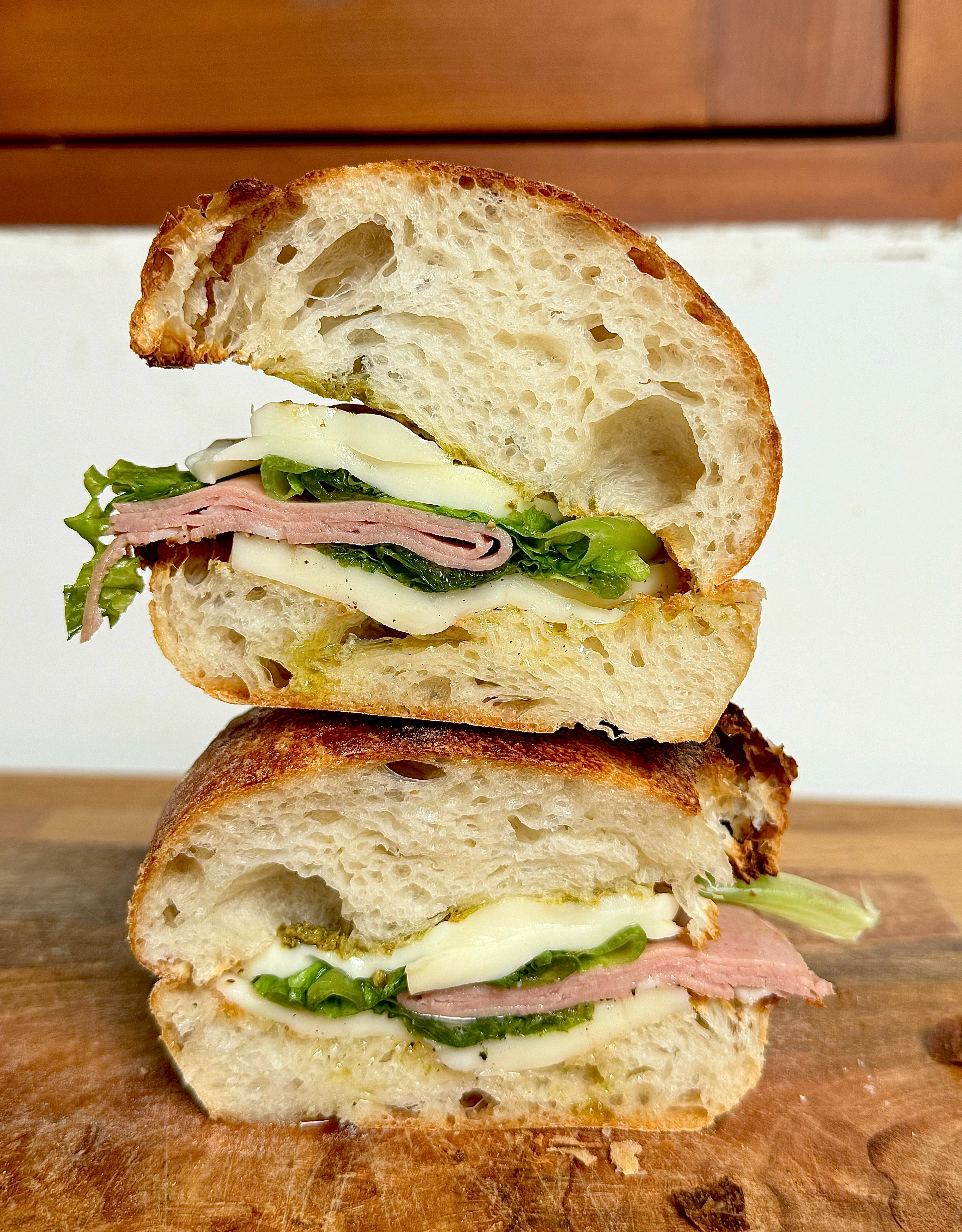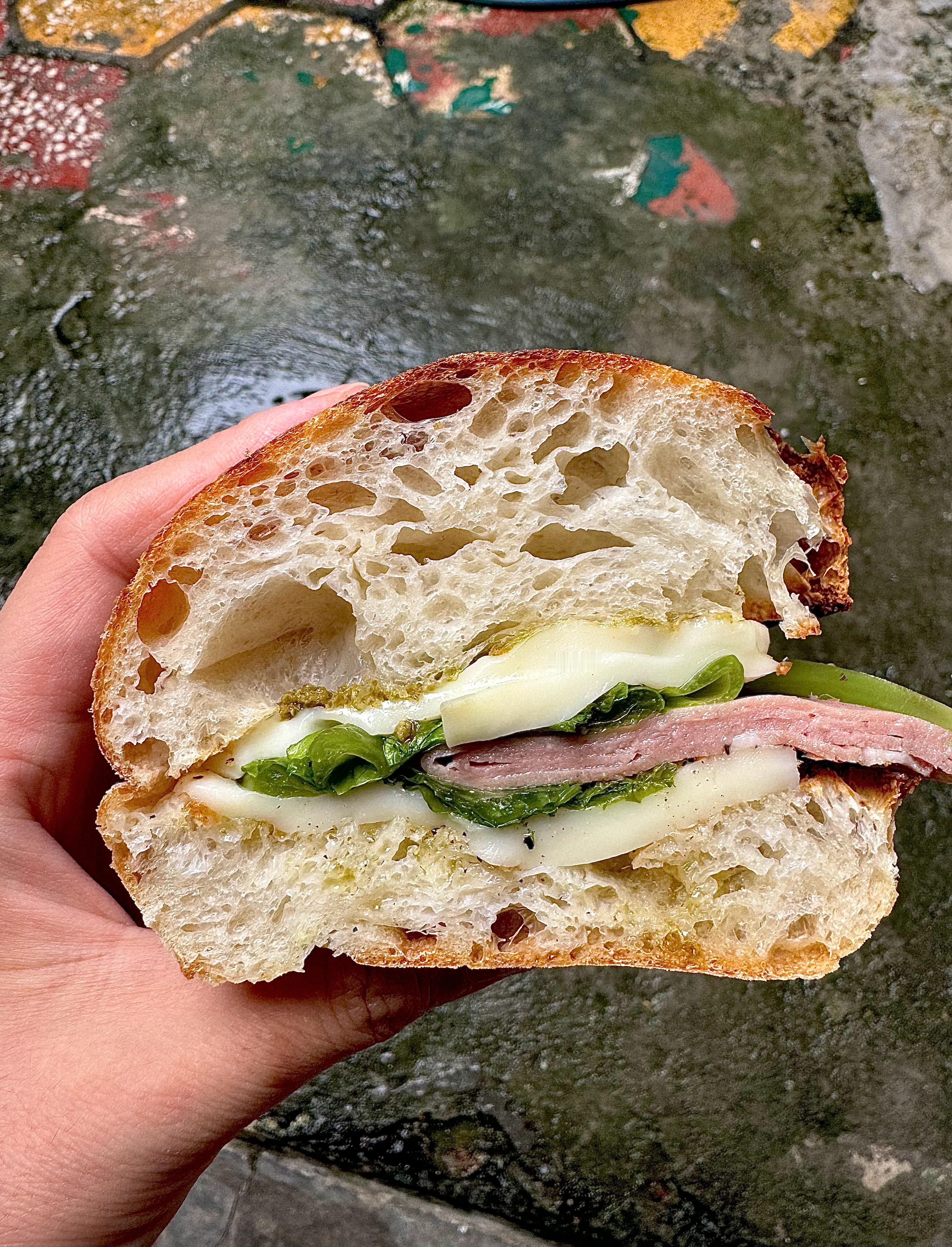 恰巴塔面包,马苏里拉奶酪还有火腿片,再抹上酱汁,雨天的颐和路和江边,完美。